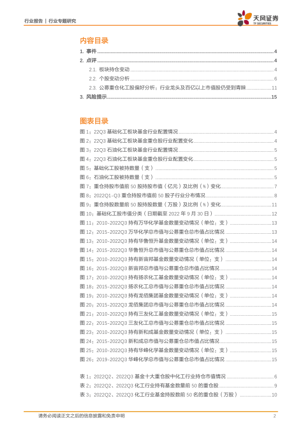 本报告利用2022年Q3公募基金重仓股数据,对基础化工和石油化工行业进行了深入的市场分析。结果显示,尽管基础化工板块的配置比例略有下降,但大型龙头企业仍然受到机构投资者的持续关注。石油化工板块则呈现增长趋势。报告同时指出了投资该行业的潜在风险,为投资者提供了参考信息。 报告数据主要来源于Wind数据库,并结合天风证券研究所的分析。 需要注意的是,报告结论基于特定时间点的数据,未来市场走势可能存在变化。