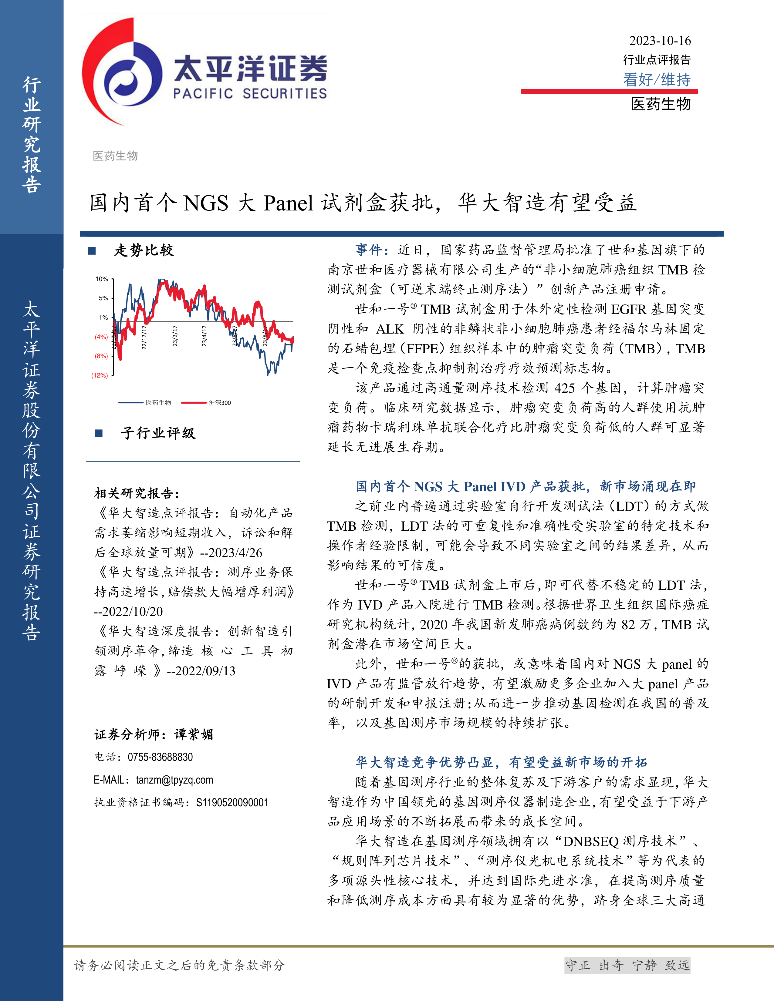 医药生物行业:国内首个NGS大Panel试剂盒获批,华大智造有望受益