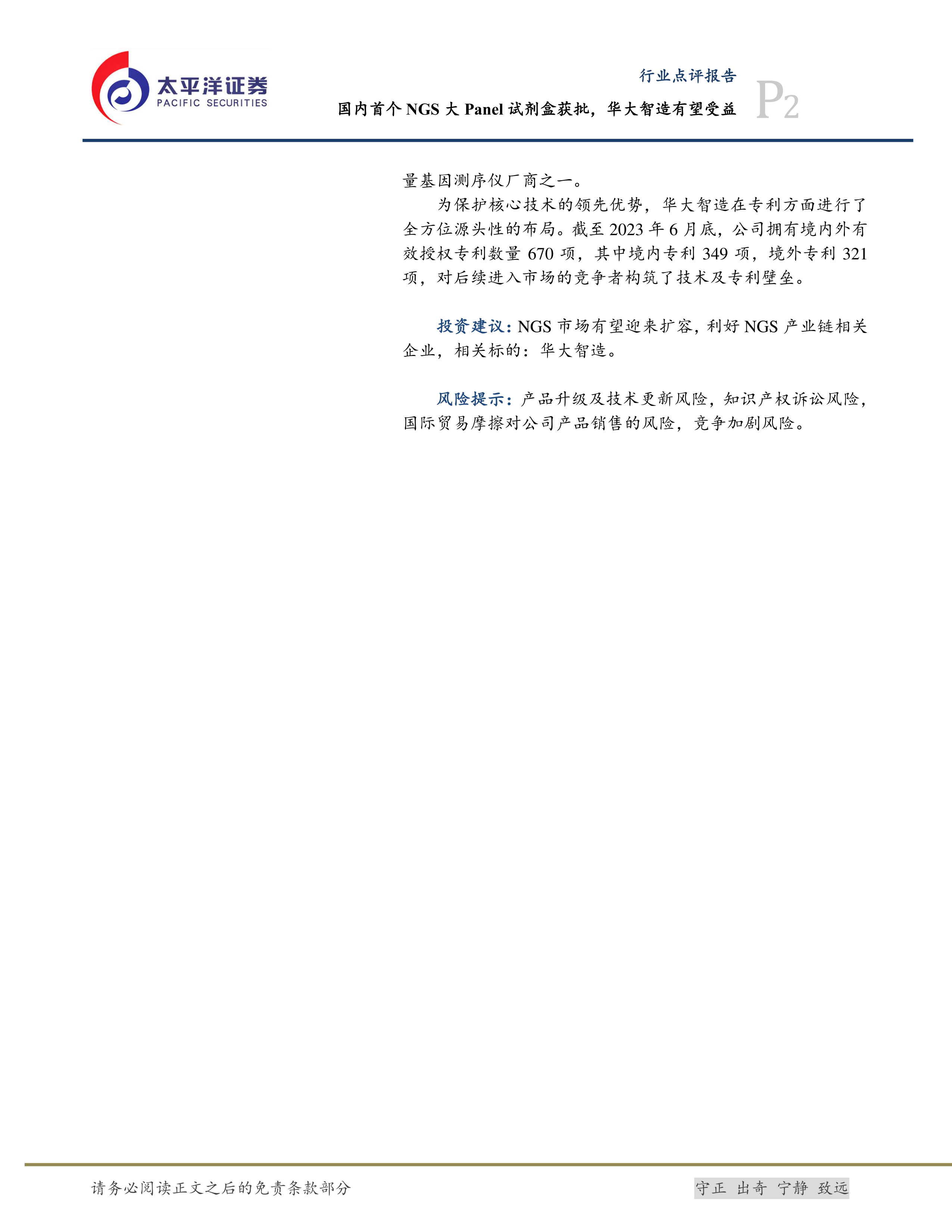 本报告的核心观点是:国内首个NGS大Panel试剂盒(“世和一号”)获批上市,标志着中国基因检测技术取得重大突破,并有望推动NGS大Panel市场扩容。华大智造作为NGS测序仪器制造商,将受益于此市场增长,其竞争优势在于拥有多项核心技术和专利布局。然而,市场竞争加剧、知识产权风险以及国际贸易摩擦等因素仍需关注。