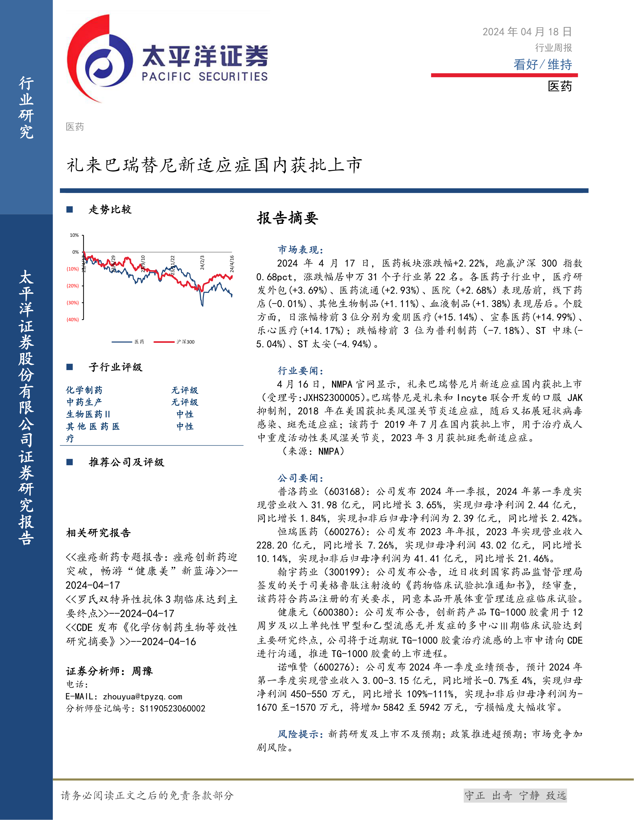 本报告对2024年4月18日医药行业进行了周报总结,分析了行业整体表现、子行业发展趋势以及个股市场表现。礼来巴瑞替尼新适应症的获批是行业的重要利好消息,但市场仍存在风险。部分医药公司业绩表现亮眼,但也存在个股分化严重的情况。投资者需密切关注行业动态、公司业绩以及市场风险,谨慎进行投资决策。 未来需持续关注创新药研发进展、政策法规变化以及市场竞争格局,以更好地把握投资机会。