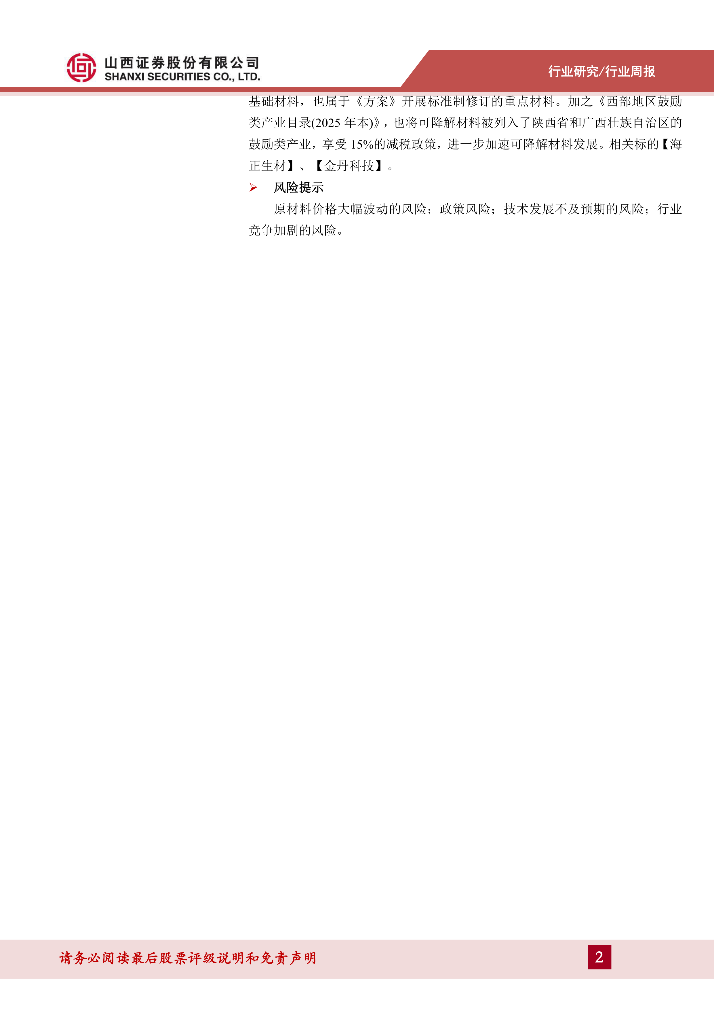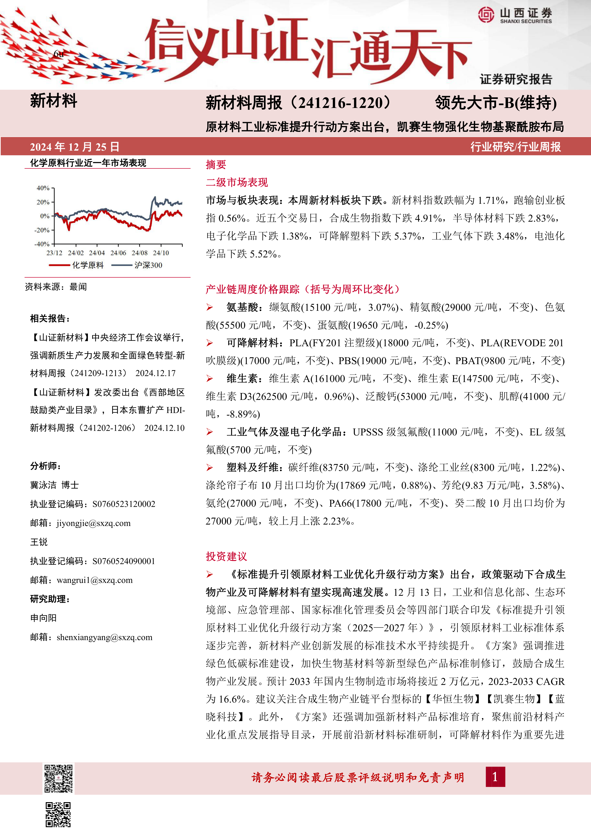 物产业及可降解材料有望实现高速发展。12月13日,工业和信息化部、生态环境部、应急管理部、国家标准化管理委员会等四部门联合印发《标准提升引领原材料工业优化升级行动方案(2025—2027年)》,引领原材料工业标准体系逐步完善,新材料产业创新发展的标准技术水平持续提升。《方案》强调推进绿色低碳标准建设,加快生物基材料等新型绿色产品标准制修订,鼓励合成生物产业发展。预计2033年国内生物制造市场将接近2万亿元,2023-2033CAGR为16.6%。建议关注合成生物产业链平台型标的【华恒生物】【凯赛生物】【蓝晓科技】。此外,《方案》还强调加强新材料产品标准培育,聚焦前沿材料产业化重点发展指导目录,开展前沿新材料标准研制,可降解材料作为重要先进基础材料,也属于《方案》开展标准制修订的重点材料。加之《西部地区鼓励类产业目录(2025年本)》,也将可降解材料被列入了陕西省和广西壮族自治区的鼓励类产业,享受15%的减税政策,进一步加速可降解材料发展。相关标的【海正生材】、【金丹科技】。