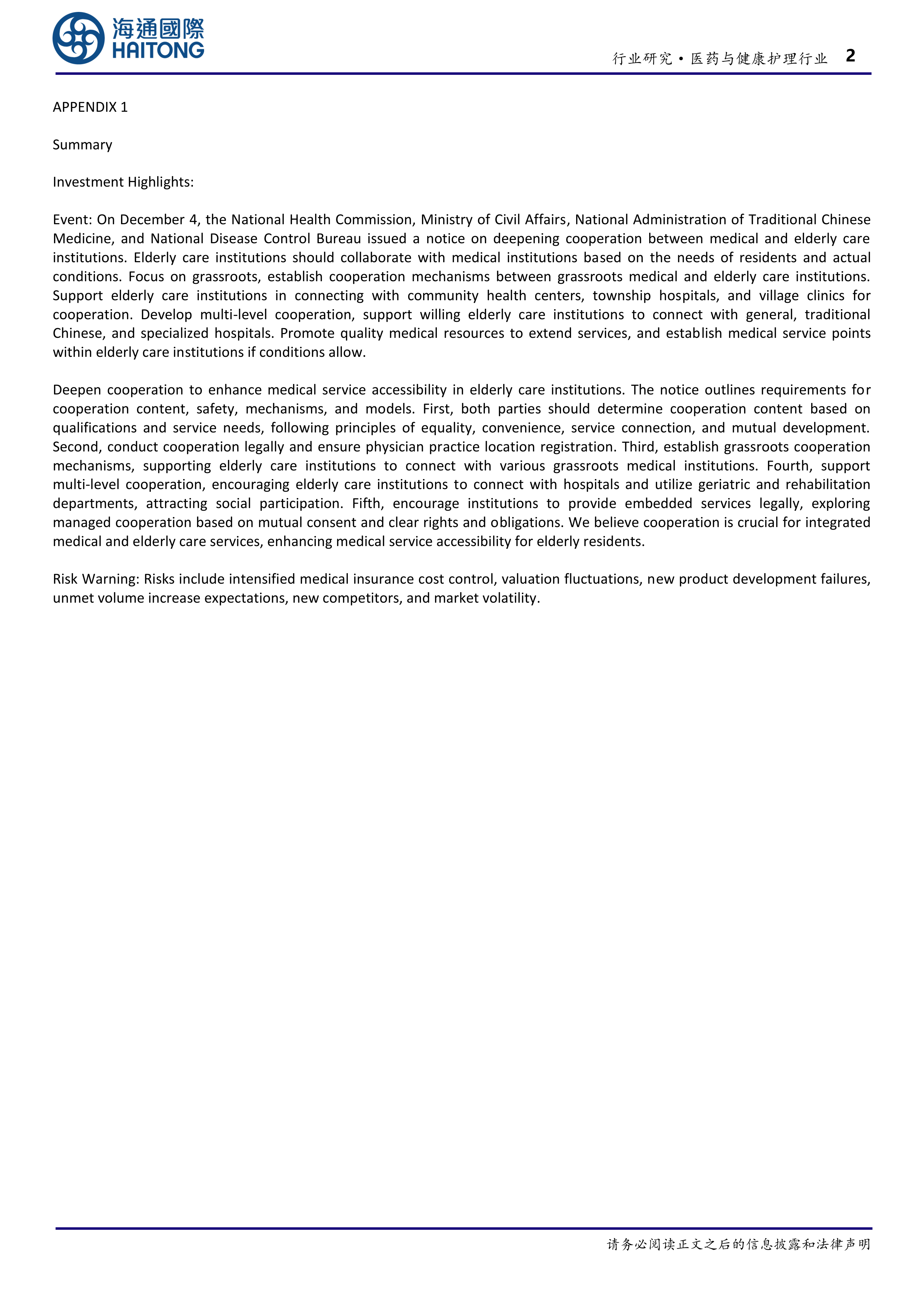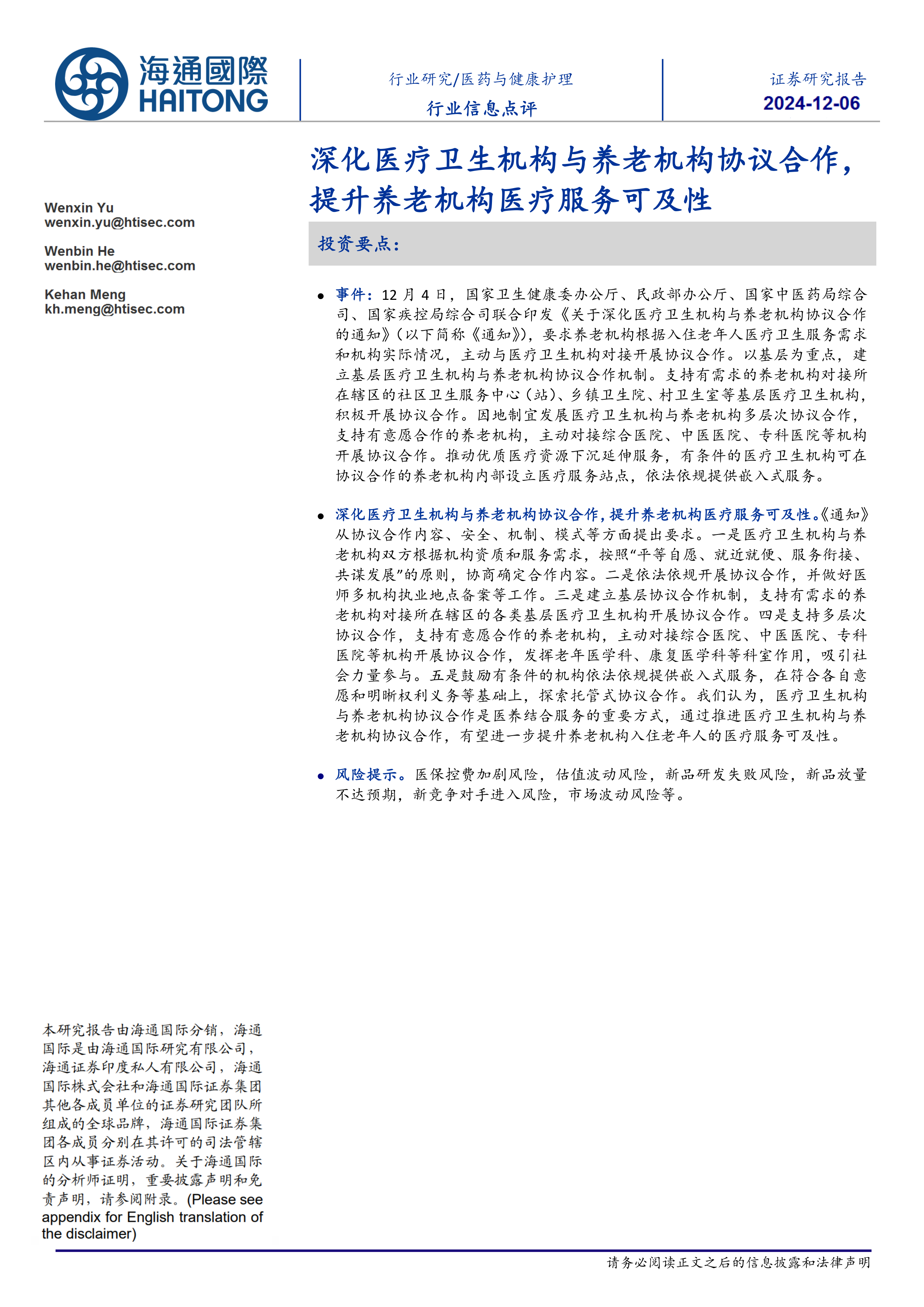 本报告的核心观点是:国家政策推动医疗卫生机构与养老机构深化协议合作,旨在提升养老机构老年人的医疗服务可及性。此举是医养结合的重要举措,但同时也面临医保控费加剧、估值波动等风险。