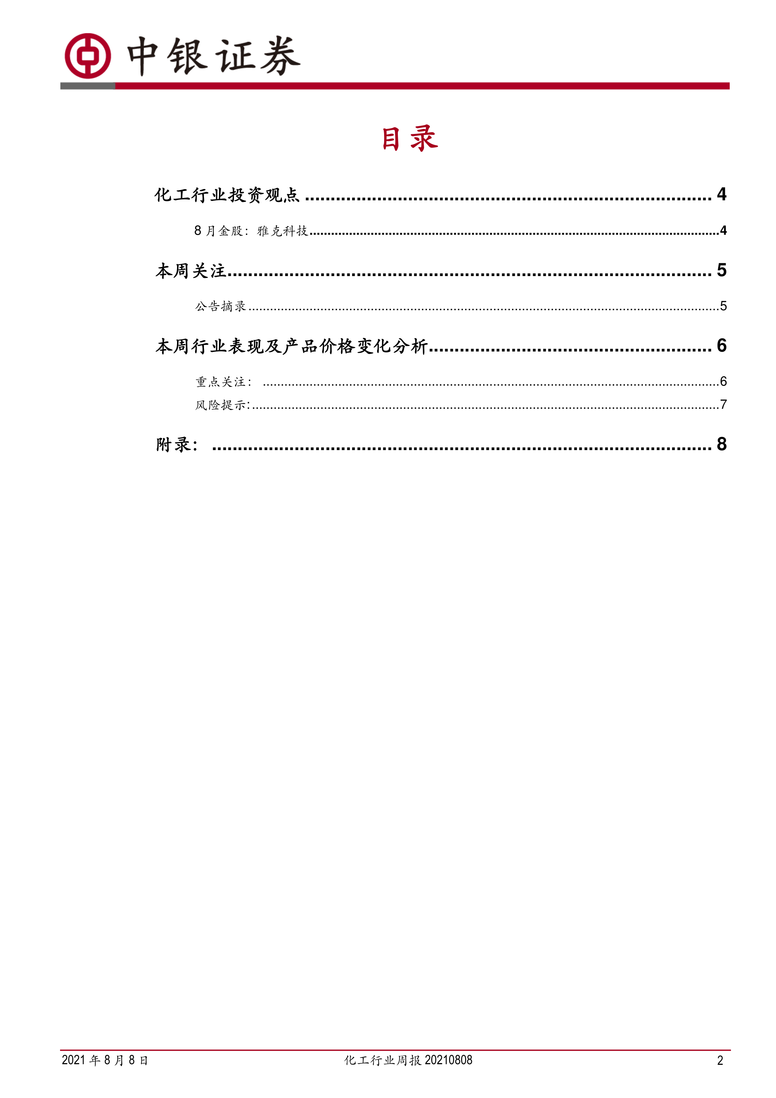 本报告对2021年8月8日一周的化工行业进行了全面分析,指出化工行业周期性波动加剧,细分产品价格差异显著,部分成长性子行业展现出强劲增长潜力。中报披露期临近,行业龙头企业有望超预期。报告还提供了具体的投资建议和个股推荐,并对行业动态和上市公司公告进行了总结。 然而,报告也提示了地缘政治因素变化和全球疫情形势变化可能带来的风险。 投资者需谨慎参考报告内容,并结合自身情况进行独立判断。