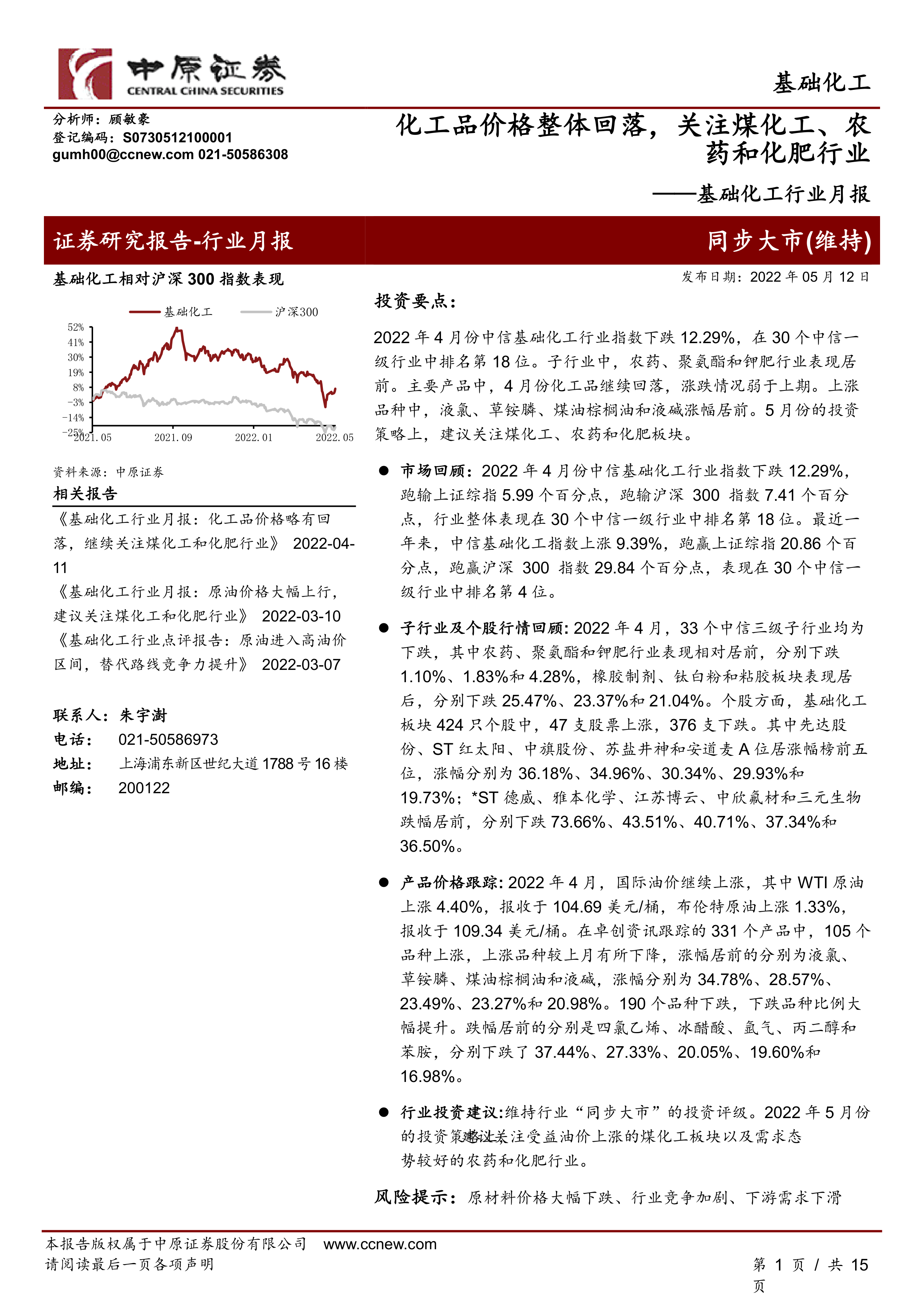 本报告的核心观点是:2022年4月份,基础化工行业整体表现疲软,中信基础化工行业指数下跌12.29%,跑输大盘,但长期来看仍具备增长潜力。建议关注煤化工、农药和化肥板块的投资机会。 具体而言,报告分析了以下几个方面:
