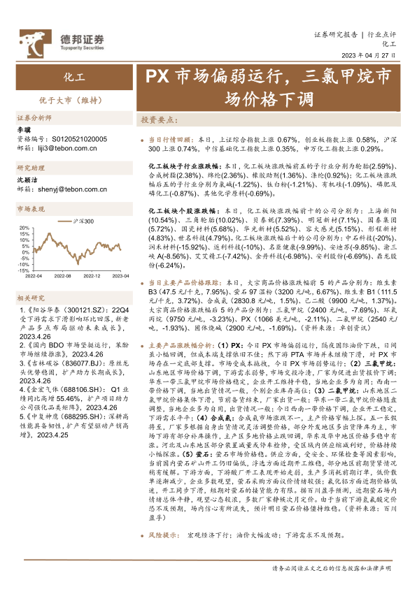 本报告对2023年4月27日化工市场进行了简要分析,指出化工板块整体表现偏弱,但板块内部存在显著分化。主要产品价格波动较大,PX和三氯甲烷价格下跌,而维生素B3和萤石价格上涨。这些价格波动受到多种因素的影响,包括国际油价、下游需求、季节性因素以及环保政策等。投资者需密切关注市场动态,谨慎投资。 报告中提到的相关研究报告可以为投资者提供更深入的行业分析和公司研究。 未来市场走势仍存在不确定性,宏观经济下行、油价大幅波动以及下游需求不及预期等风险因素值得关注。