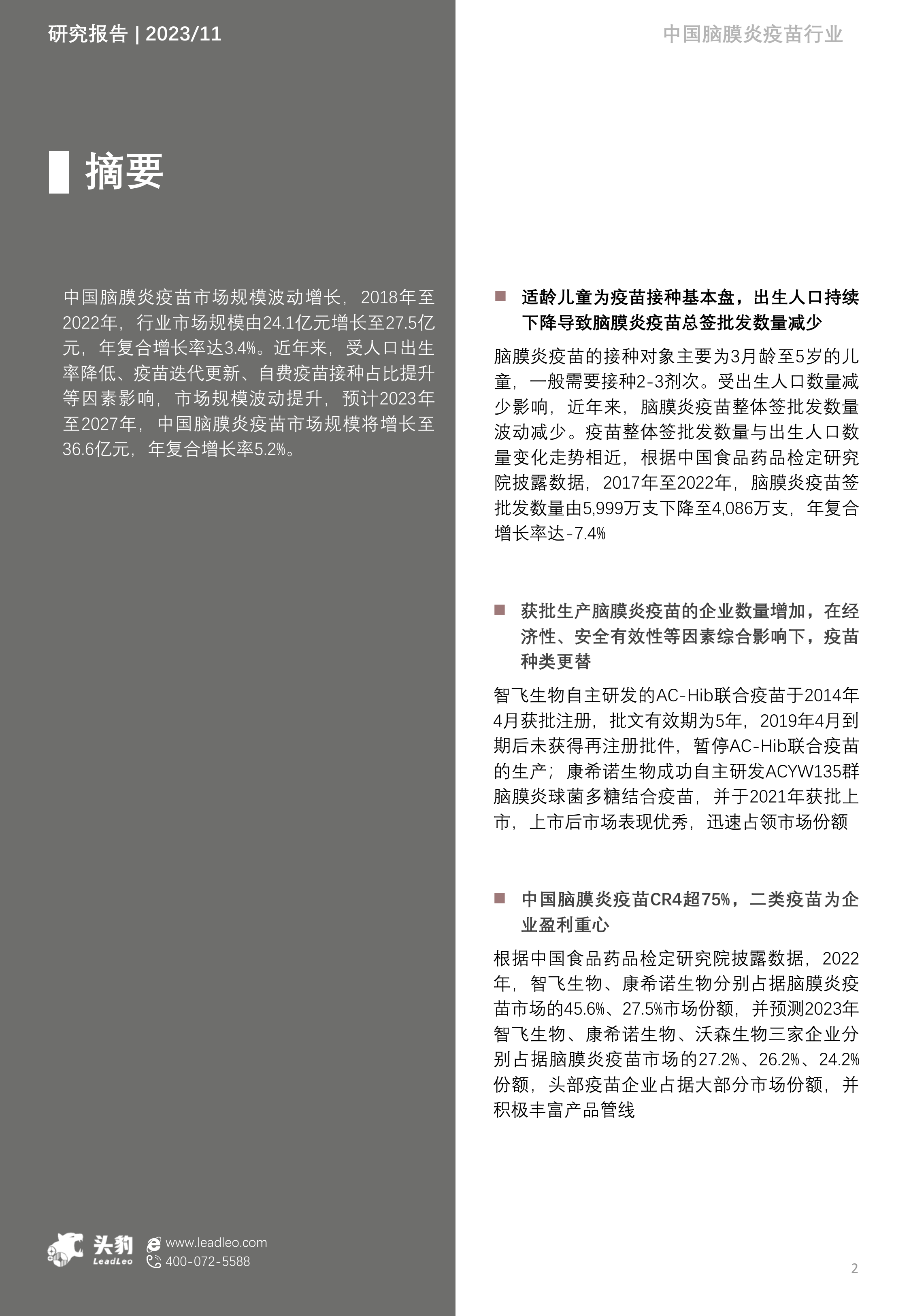 本报告基于头豹研究院对2023年中国脑膜炎疫苗行业的分析,核心观点如下: