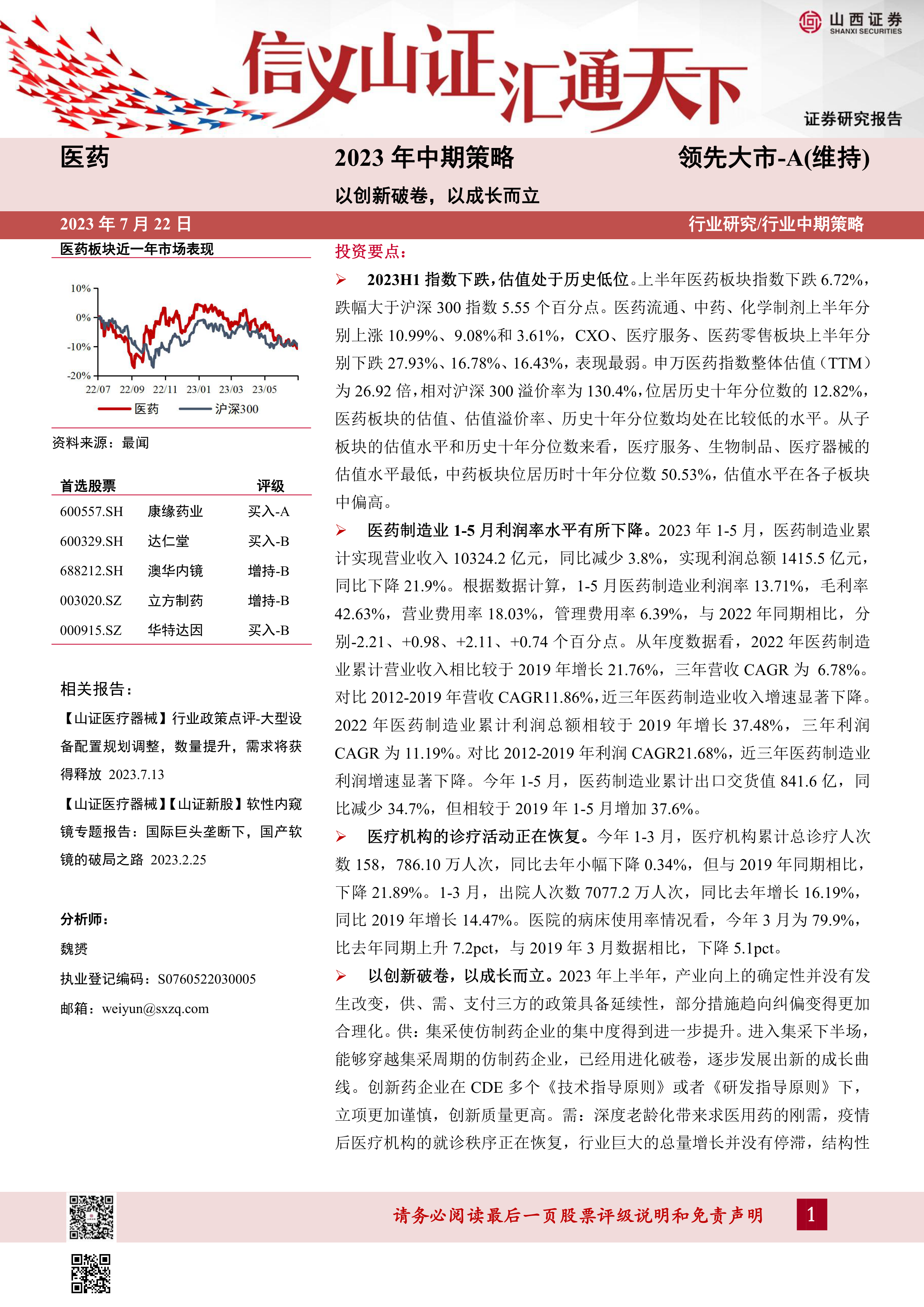 本报告对2023年上半年医药行业进行了全面的分析,指出医药板块整体表现疲软,但估值处于历史低位,产业升级趋势明确。 报告建议投资者关注创新药、医疗器械、仿制药和中药四个板块的结构性机会,并推荐了五家重点公司。 投资者需注意报告中列出的风险因素,谨慎投资。 报告中大量的数据和图表为分析结论提供了有力支撑,体现了专业性和客观性。