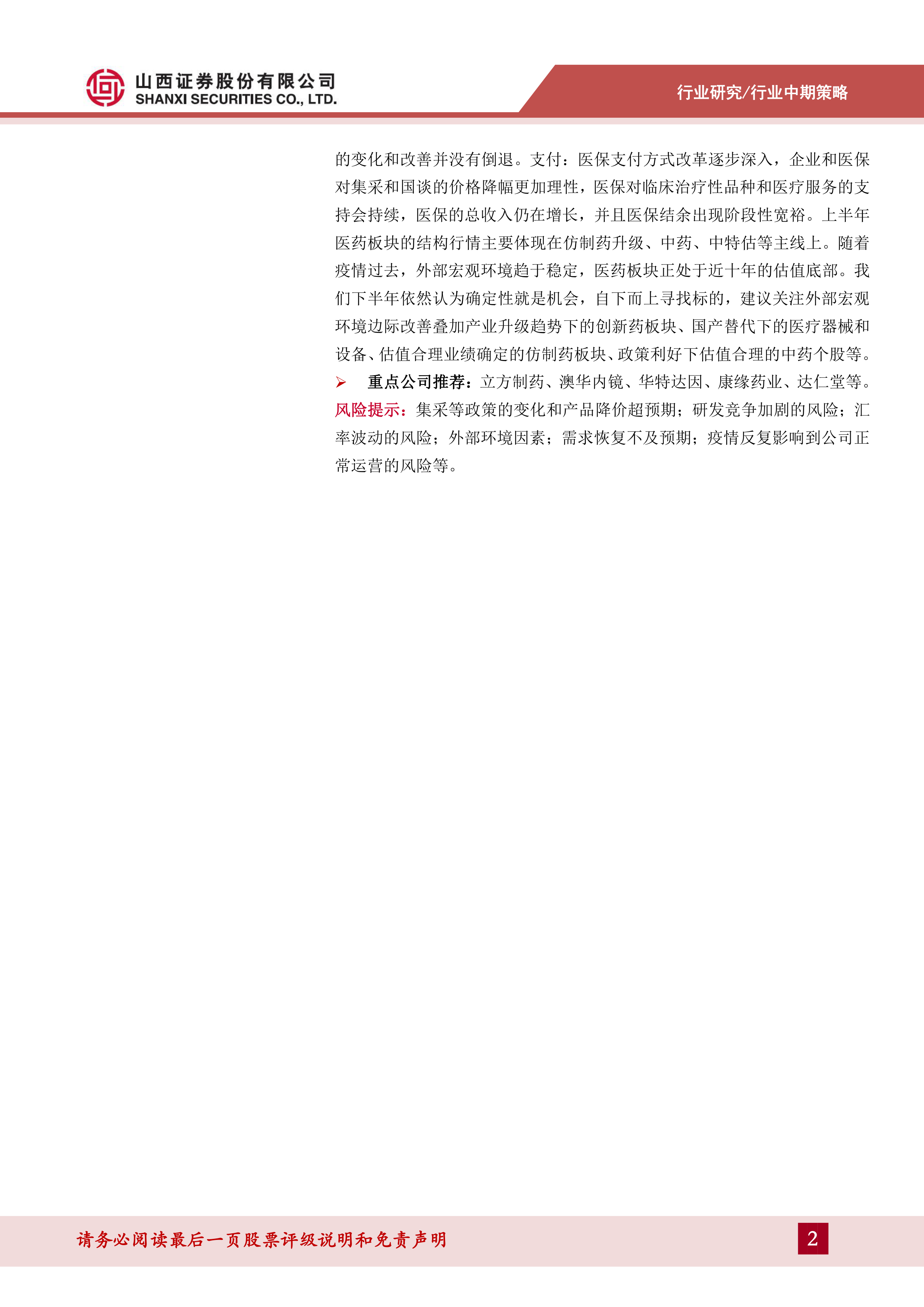 以创新破卷,以成长而立。2023年上半年,产业向上的确定性并没有发生改变,供、需、支付三方的政策具备延续性,部分措施趋向纠偏变得更加合理化。供:集采使仿制药企业的集中度得到进一步提升。进入集采下半场,能够穿越集采周期的仿制药企业,已经用进化破卷,逐步发展出新的成长曲线。创新药企业在CDE多个《技术指导原则》或者《研发指导原则》下,立项更加谨慎,创新质量更高。需:深度老龄化带来求医用药的刚需,疫情后医疗机构的就诊秩序正在恢复,行业巨大的总量增长并没有停滞,结构性的变化和改善并没有倒退。支付:医保支付方式改革逐步深入,企业和医保对集采和国谈的价格降幅更加理性,医保对临床治疗性品种和医疗服务的支持会持续,医保的总收入仍在增长,并且医保结余出现阶段性宽裕。上半年医药板块的结构行情主要体现在仿制药升级、中药、中特估等主线上。随着疫情过去,外部宏观环境趋于稳定,医药板块正处于近十年的估值底部。我们下半年依然认为确定性就是机会,自下而上寻找标的,建议关注外部宏观环境边际改善叠加产业升级趋势下的创新药板块、国产替代下的医疗器械和设备、估值合理业绩确定的仿制药板块、政策利好下估值合理的中药个股等。