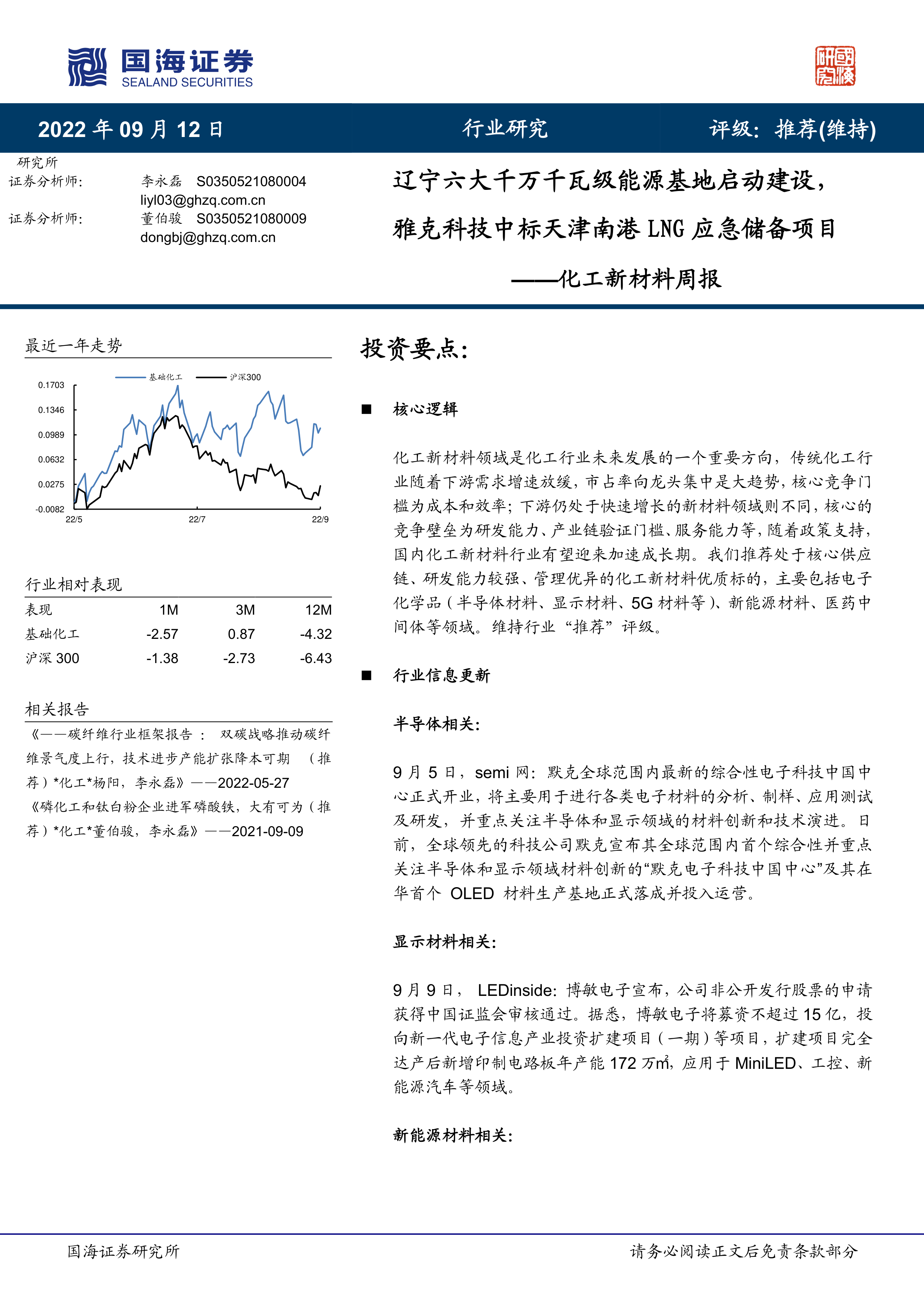化工新材料周报:辽宁六大千万千瓦级能源基地启动建设,雅克科技中标天津南港LNG应急储备项目