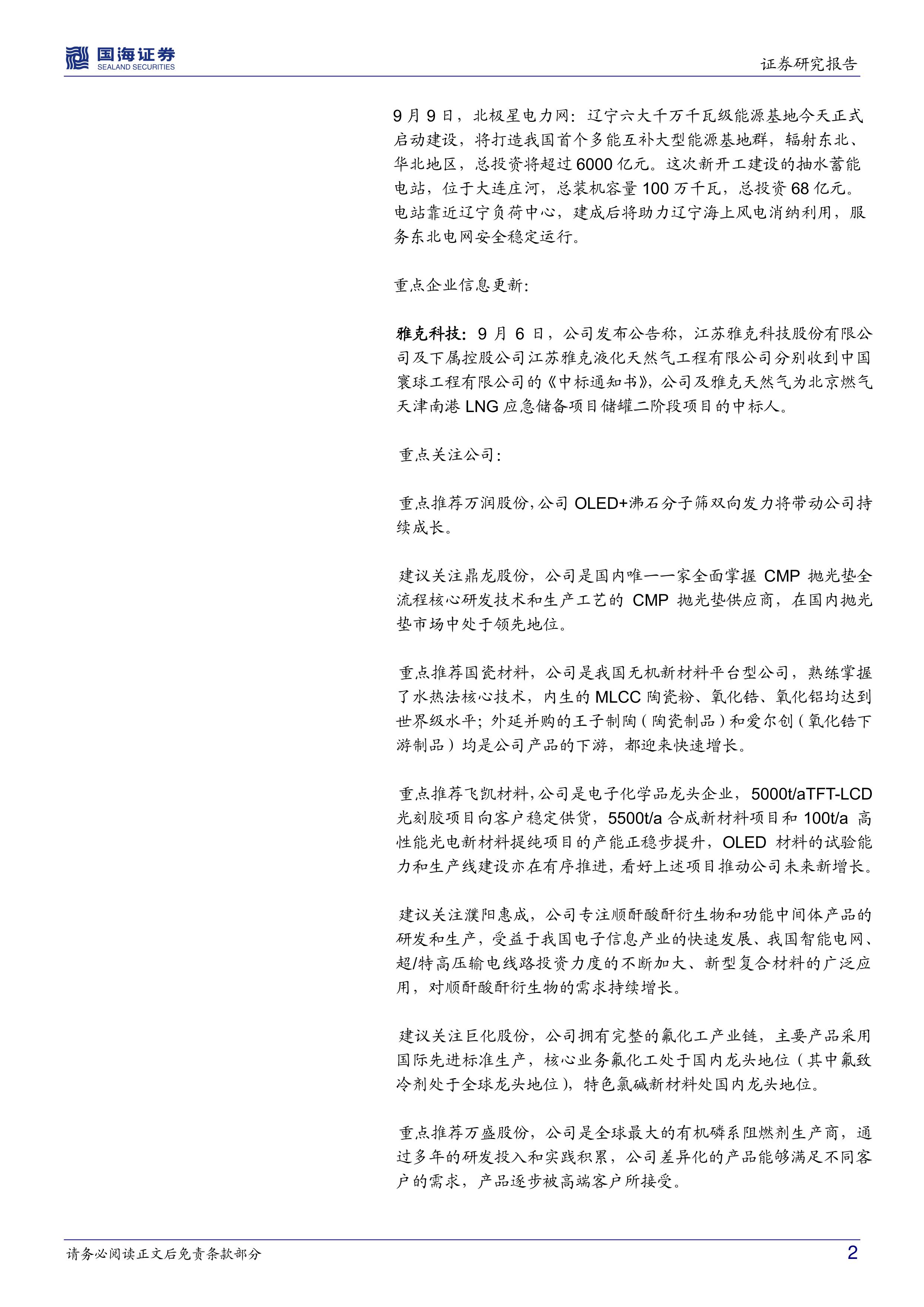 重点推荐飞凯材料, 公司是电子化学品龙头企业, 5000t/aTFT-LCD光刻胶项目向客户稳定供货,5500t/a 合成新材料项目和 100t/a 高性能光电新材料提纯项目的产能正稳步提升,OLED 材料的试验能力和生产线建设亦在有序推进,看好上述项目推动公司未来新增长。建议关注濮阳惠成,公司专注顺酐酸酐衍生物和功能中间体产品的研发和生产,受益于我国电子信息产业的快速发展、我国智能电网、超/特高压输电线路投资力度的不断加大、新型复合材料的广泛应用,对顺酐酸酐衍生物的需求持续增长。