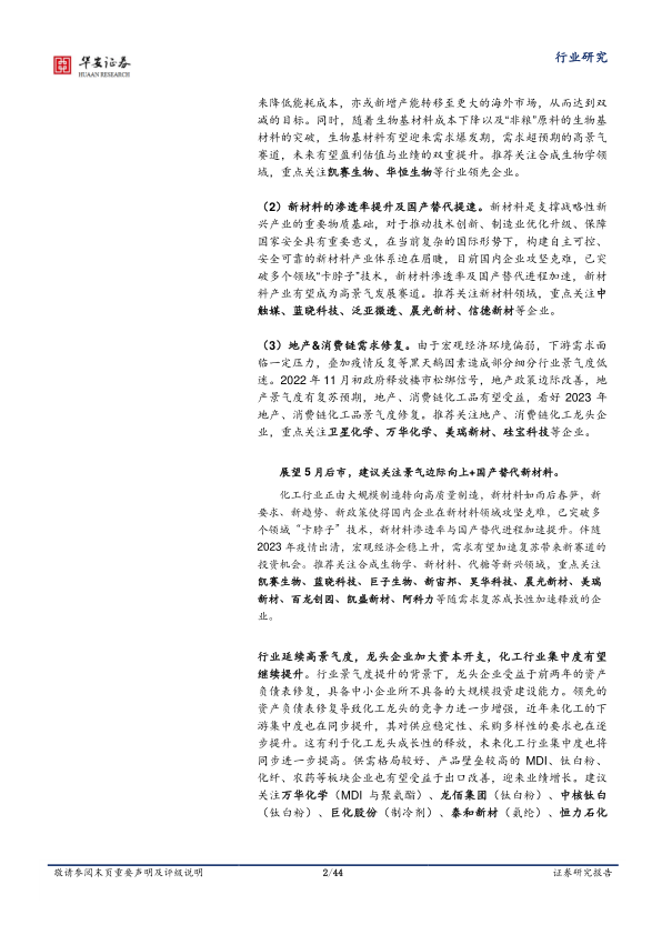化工行业正由大规模制造转向高质量制造,新材料如雨后春笋,新要求、新趋势、新政策使得国内企业在新材料领域攻坚克难,已突破多个领域“卡脖子”技术,新材料渗透率与国产替代进程加速提升。伴随2023年疫情出清,宏观经济企稳上升,需求有望加速复苏带来新赛道的投资机会。推荐关注合成生物学、新材料、代糖等新兴领域,重点关注凯赛生物、蓝晓科技、巨子生物、新宙邦、昊华科技、晨光新材、美瑞新材、百龙创园、凯盛新材、阿科力等随需求复苏成长性加速释放的企业。
