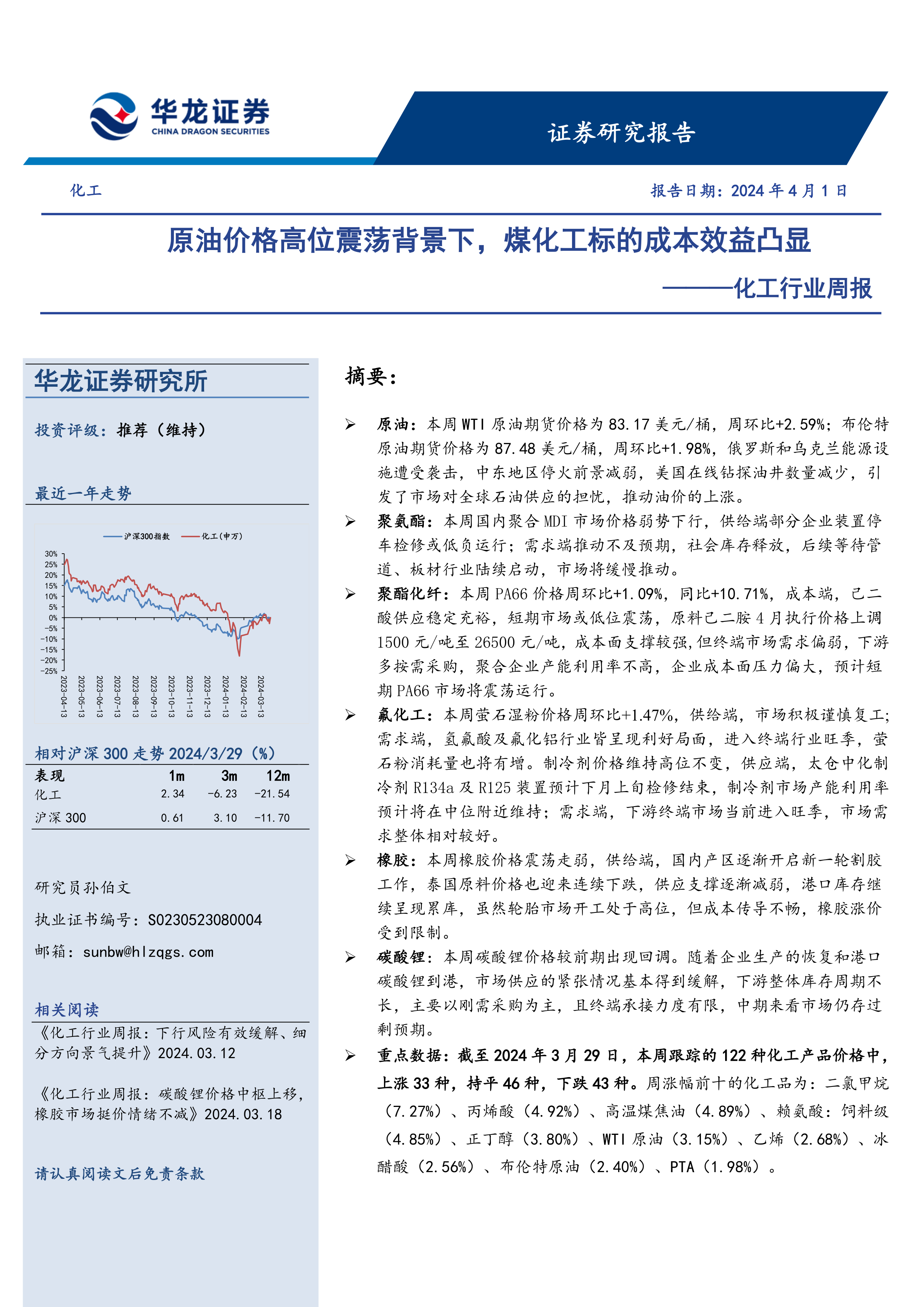 化工行业周报:原油价格高位震荡背景下,煤化工标的成本效益凸显