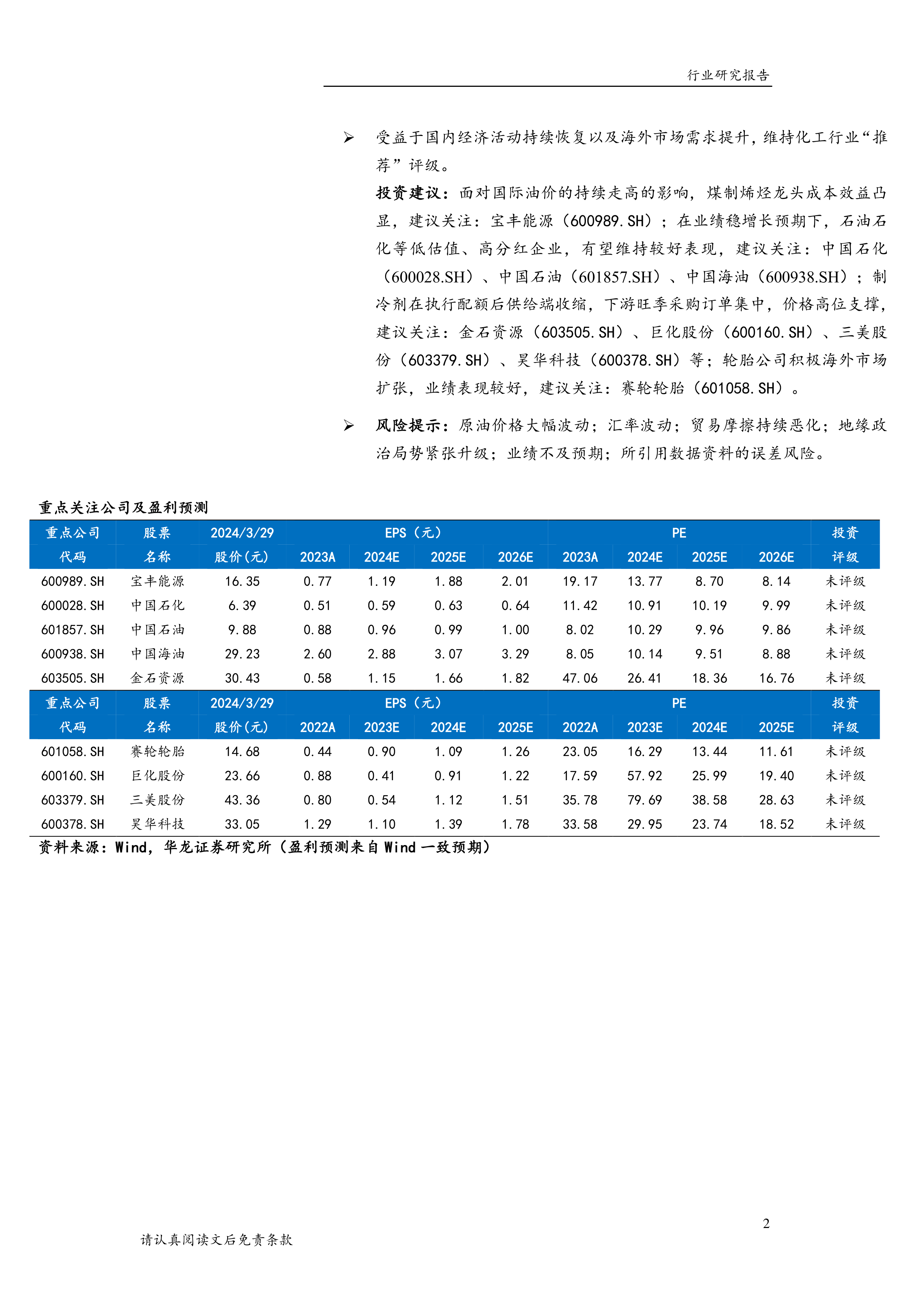 报告对化工行业整体保持“推荐”评级,并根据不同细分领域的市场表现,分别提出了相应的投资建议,例如关注煤制烯烃龙头企业、低估值高分红石油石化企业、制冷剂行业企业以及轮胎企业等。