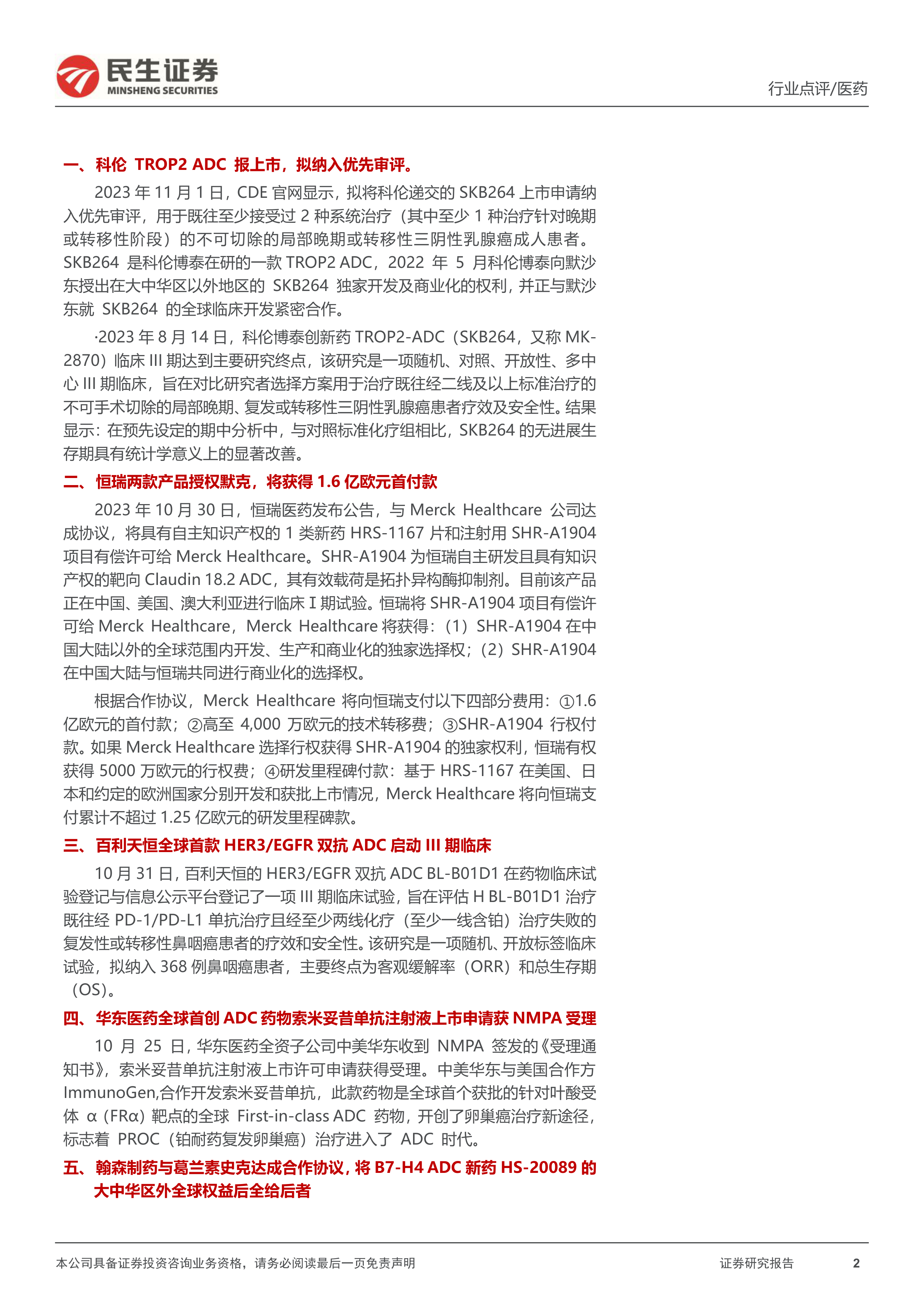 ADC研发进展不断,创新布局逐步进入兑现时代。2023年10月19日,默沙东与第一三共就第一三共的三款ADC候选药物达成了全球开发和商业化协议;2023年10月20日翰森制药与葛兰素史克共同宣布,双方就ADC新药HS-20089达成独家许可协议;2023年10月25日,华东医药全资子公司中美华东收到NMPA签发的《受理通知书》,索米妥昔单抗注射液上市许可申请获得受理;2023年10月30日,恒瑞医药将具有自主知识产权的1类新药HRS-1167片和注射用SHR-A1904项目有偿许可给MerckHealthcare;2023年10月31日,百利天恒全球首款HER3/EGFR双抗ADC启动III期临床;2023年11月1日,科伦递交的SKB264上市申请纳入优先审评。