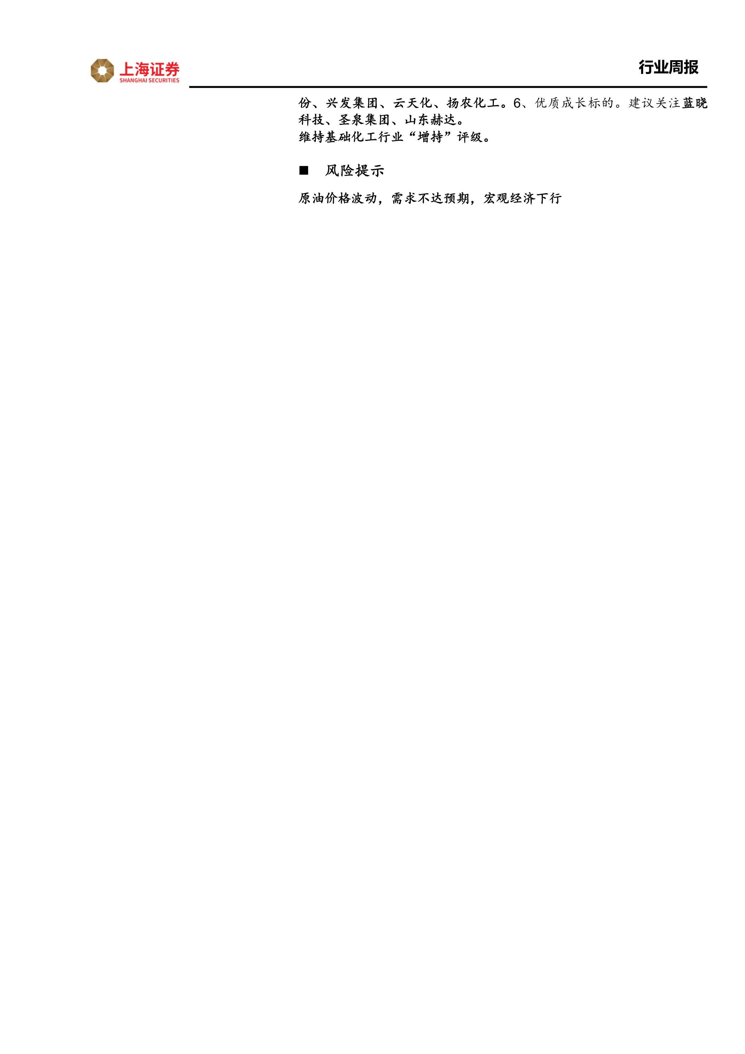 报告建议关注制冷剂、化纤、优质化工企业(万华化学等)、轮胎、农化以及优质成长标的等板块,并维持基础化工行业“增持”评级。