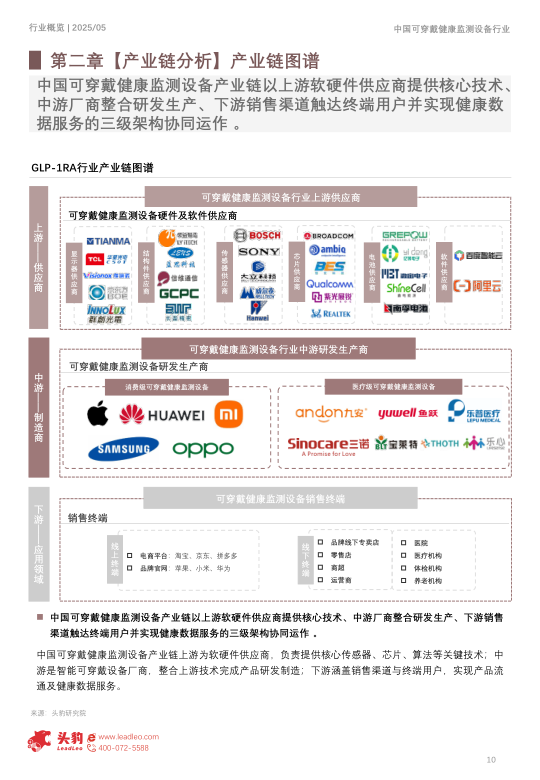 报告对可穿戴健康监测设备产业链进行了深入剖析,将其分为上游(软硬件供应商)、中游(研发生产商)和下游(销售渠道和终端用户)三个环节。