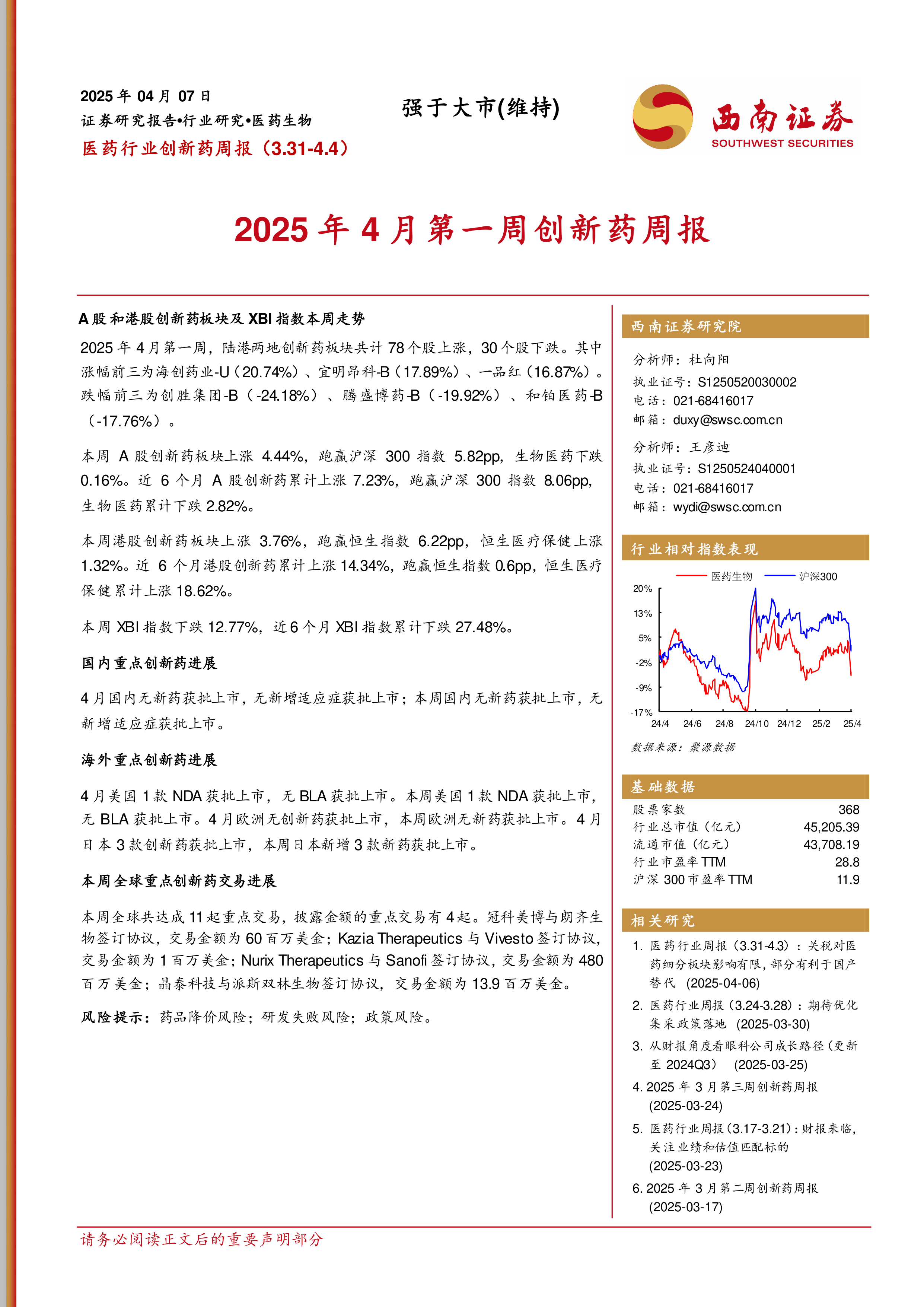 本报告的核心观点是:2025年4月第一周,A股和港股创新药板块整体表现强于大市,但美股XBI指数下跌。国内创新药研发进展方面,无新药获批上市,但多个项目取得阶段性进展;海外方面,美国FDA批准一款新药,日本批准三款新药。此外,本周全球创新药交易活跃,多起重要交易达成。