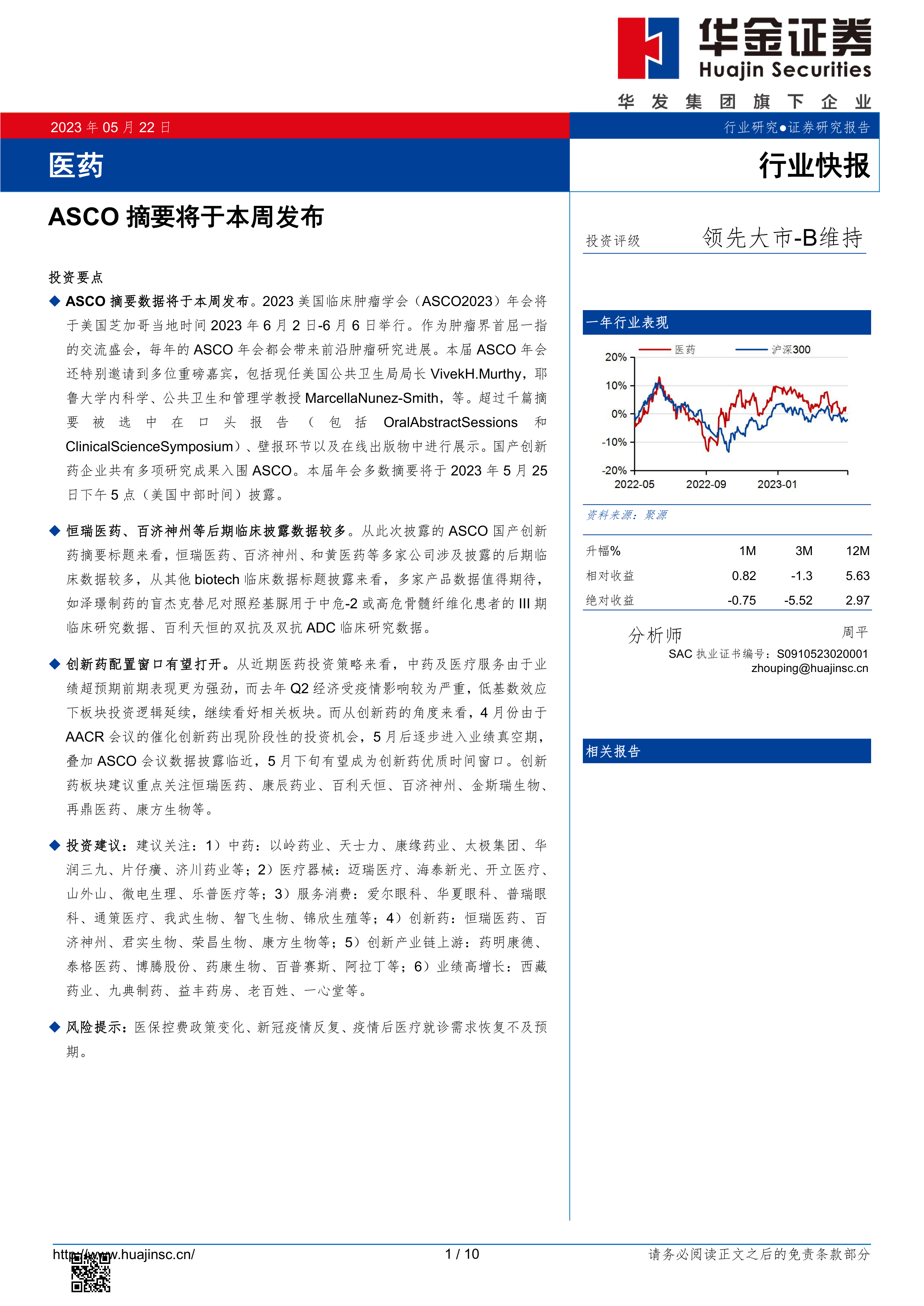 本报告基于ASCO 2023年会即将发布的摘要数据,对医药行业,特别是创新药板块的市场前景进行了分析。报告认为,ASCO 2023年会将成为创新药板块的重要催化剂,5月下旬有望成为创新药的优质配置窗口。报告重点分析了恒瑞医药、百济神州等多家企业的临床数据,并提出了相应的投资建议,同时提醒投资者关注医保控费政策变化、新冠疫情反复以及疫情后医疗就诊需求恢复不及预期等风险因素。 投资者应结合自身风险承受能力和投资目标,谨慎决策。