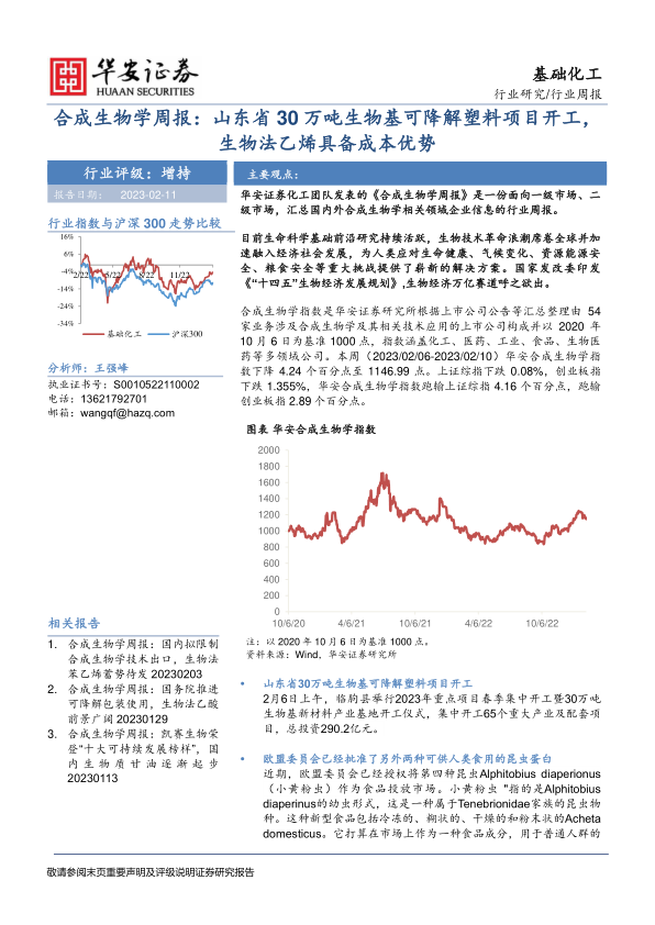 合成生物学指数是华安证券研究所根据上市公司公告等汇总整理由54家业务涉及合成生物学及其相关技术应用的上市公司构成并以2020年10月6日为基准1000点,指数涵盖化工、医药、工业、食品、生物医药等多领域公司。本周(2023/02/06-2023/02/10)华安合成生物学指数下降4.24个百分点至1146.99点。上证综指下跌0.08%,创业板指下跌1.355%,华安合成生物学指数跑输上证综指4.16个百分点,跑输创业板指2.89个百分点。