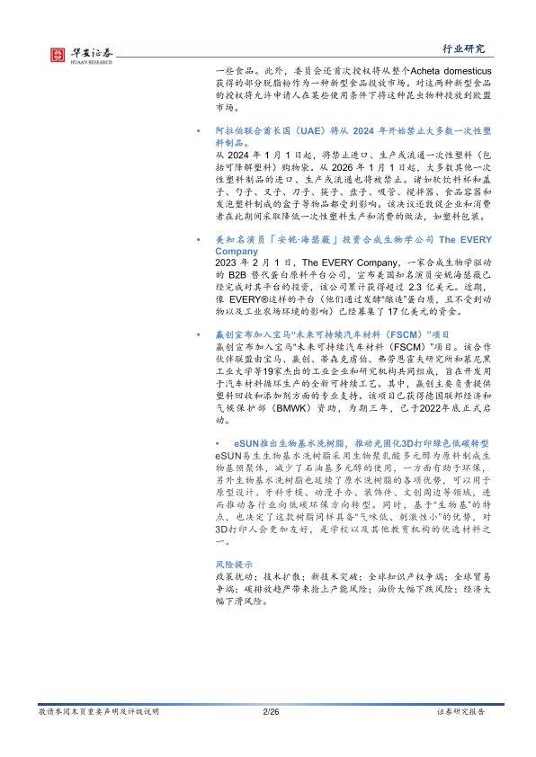 本报告通过对合成生物学行业市场动态、公司业务进展、行业融资、研发方向以及科研动态的分析,以及对Moderna公司和乙烯产业的深入研究,全面展现了合成生物学行业蓬勃发展的态势和巨大的市场潜力。虽然市场表现存在波动,但国家政策支持、技术创新以及资本市场关注都为合成生物学行业的长期发展提供了强劲动力。 生物法乙烯等新技术的突破也为传统石化产业的转型升级提供了新的方向。 然而,行业发展也面临政策扰动、技术扩散、知识产权争端等风险,需要持续关注和应对。