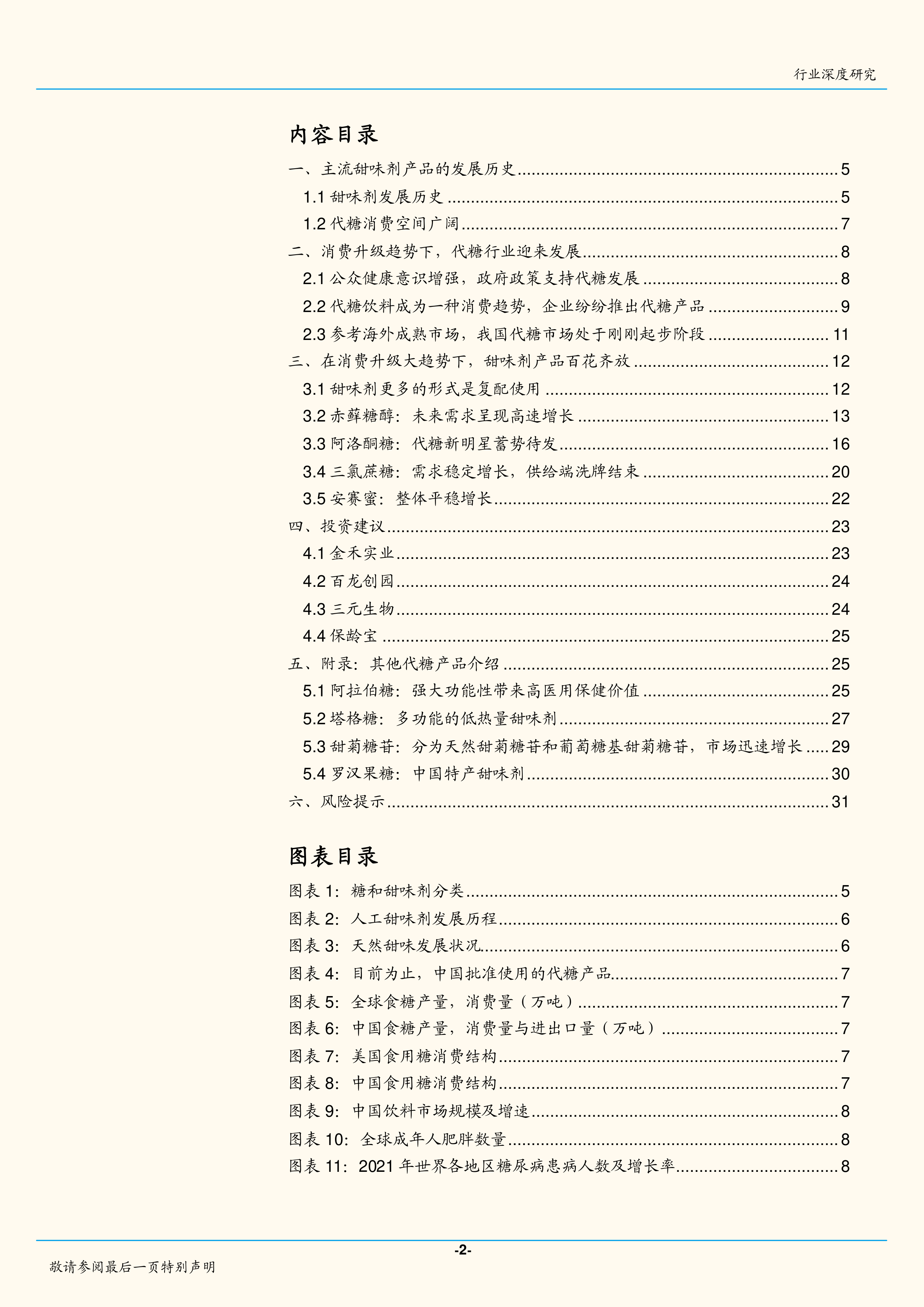 本报告的核心观点是:中国代糖行业正处于发展新阶段,消费升级趋势、政府政策支持以及饮料厂商的积极推广共同驱动了这一增长。报告重点分析了赤藓糖醇、阿洛酮糖和三氯蔗糖等主流甜味剂的市场现状、发展前景及相关企业投资价值,并指出中国代糖市场长期有望达到40%以上的渗透率,拥有巨大的发展空间。