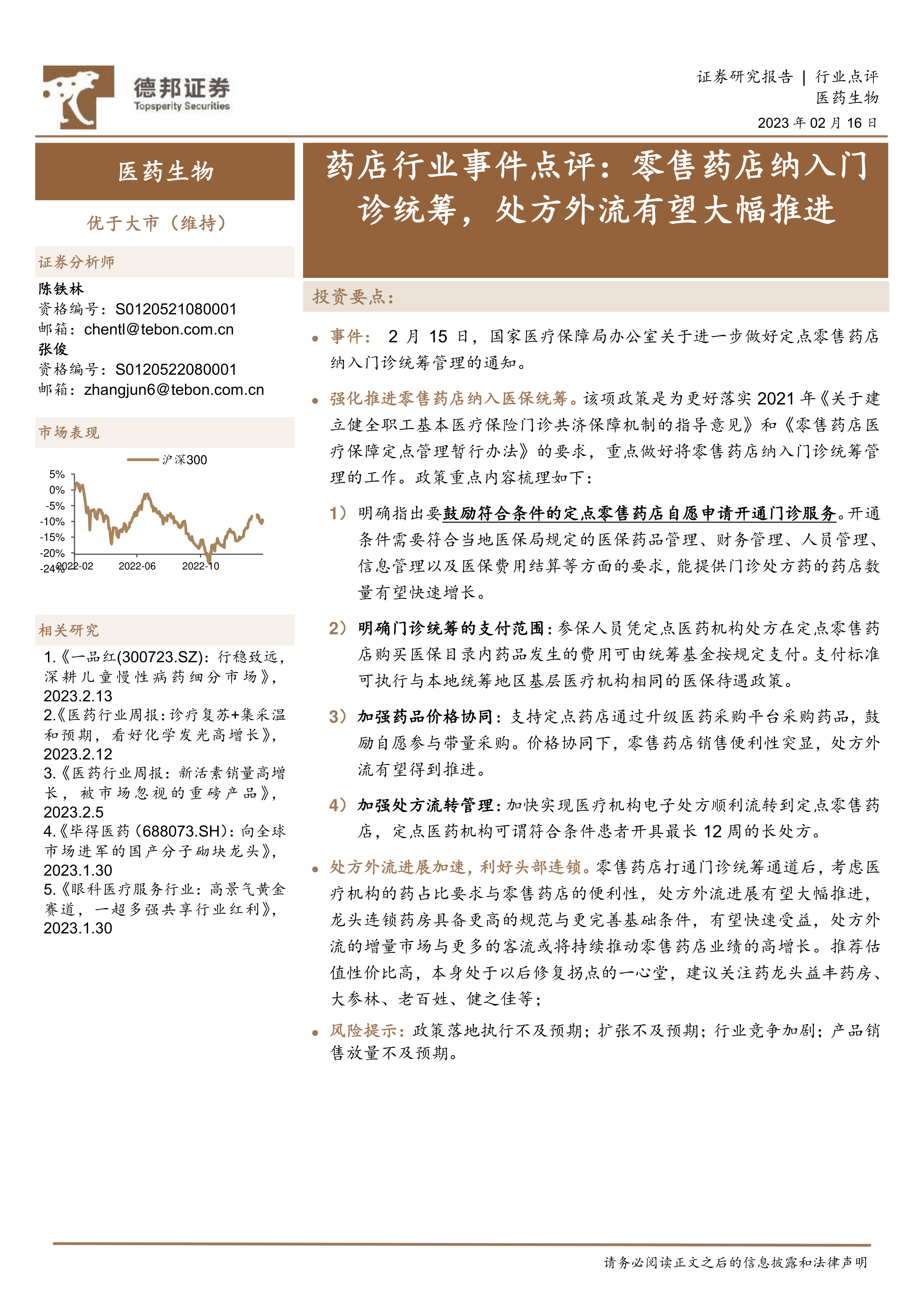 零售药店纳入门诊统筹后,结合医疗机构药占比要求和零售药店的便利性,处方外流进程有望大幅加快。龙头连锁药房凭借其规范化管理和完善的基础条件,将率先受益于这一政策。处方外流带来的增量市场和客流增长,将持续推动龙头药店业绩的高增长。报告中推荐估值性价比高,处于业绩修复拐点的一心堂,并建议关注益丰药房、大参林、老百姓、健之佳等龙头企业。