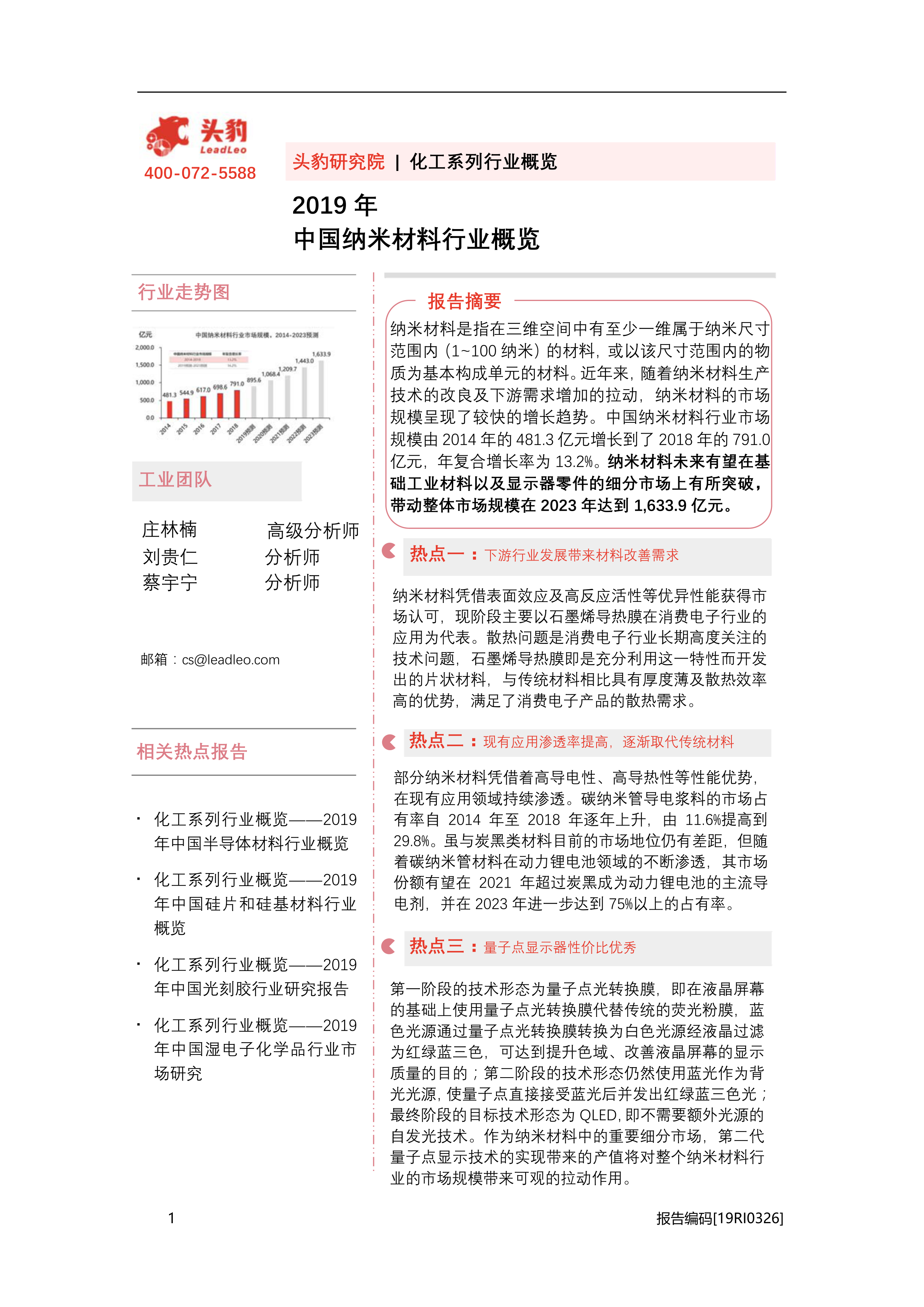 本报告基于头豹研究院发布的《2019年中国纳米材料行业概览》,运用统计数据和市场分析,对中国纳米材料行业进行全面解读。报告核心观点如下: