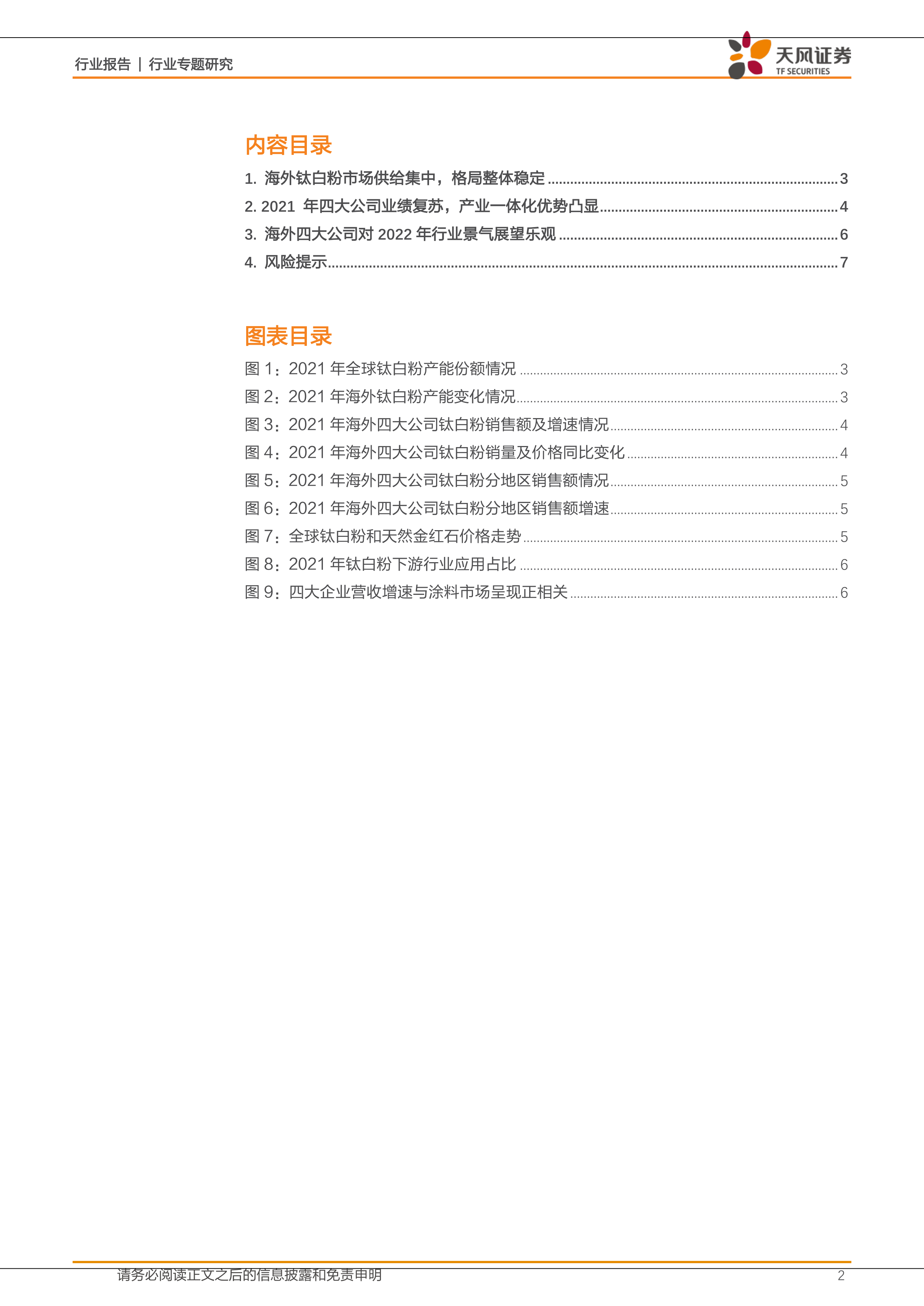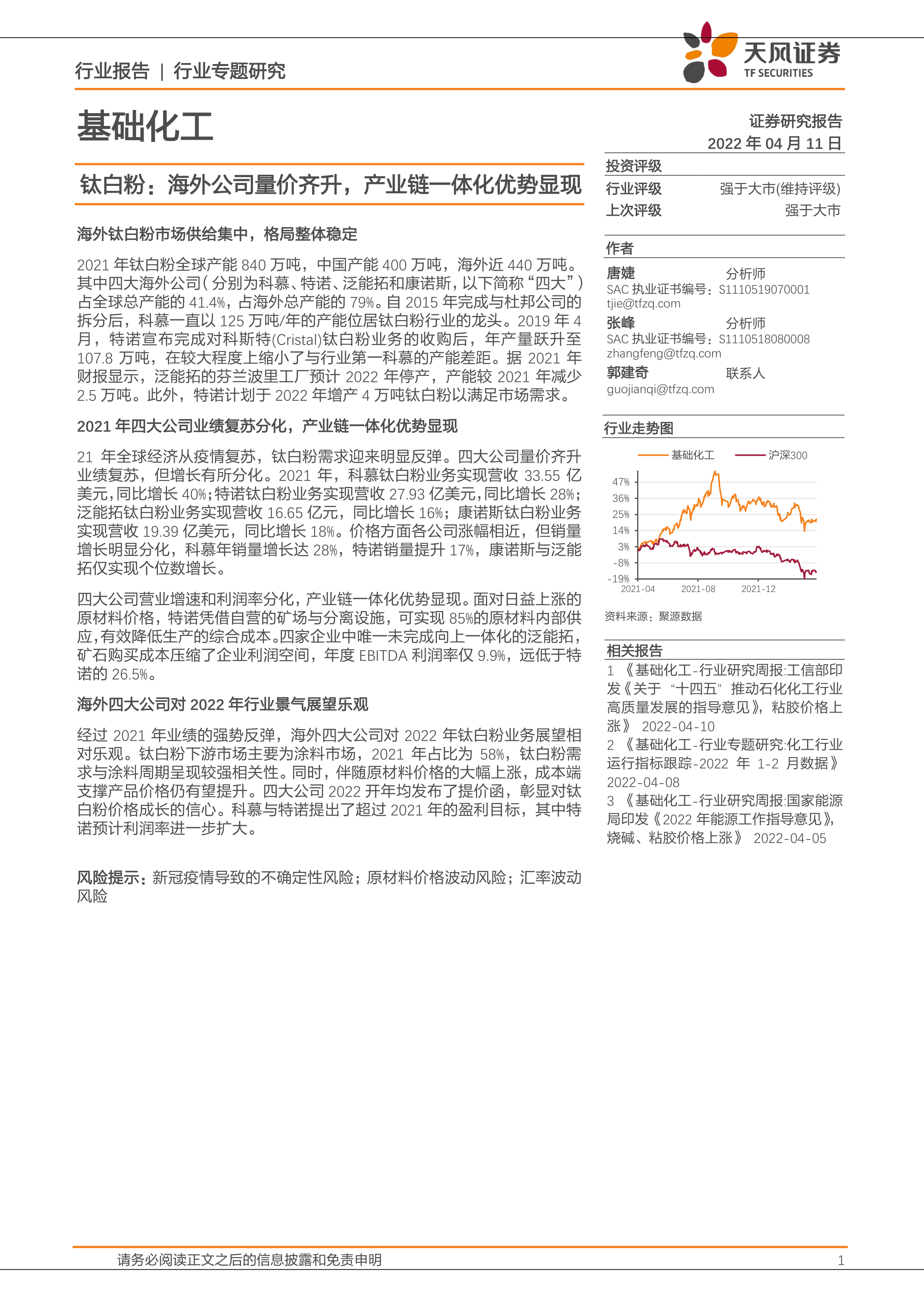 本报告分析了2021年全球钛白粉市场,特别是海外市场的供需格局、主要公司业绩表现以及未来展望。报告指出,海外钛白粉市场高度集中,产业链一体化程度是影响公司盈利能力的关键因素。2021年,海外四大公司业绩复苏,但增长分化明显,一体化程度高的公司表现更优。展望2022年,行业景气度有望持续,但仍面临原材料价格波动、疫情不确定性和汇率波动等风险。 报告数据主要来源于各公司年报、彭博数据以及天风证券研究所的分析,为投资者提供了对钛白粉行业现状和未来趋势的专业分析。