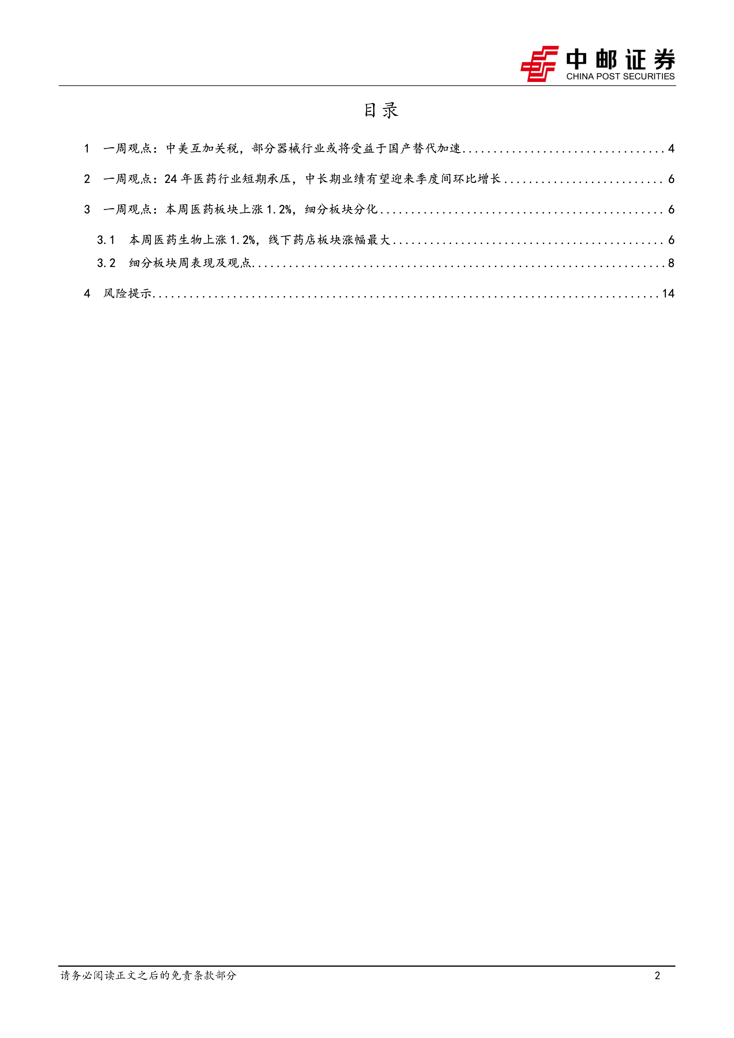 本报告的核心观点是:中美互加关税事件对医药行业的影响较为复杂,短期内部分细分板块面临承压,但长期来看,国产替代加速将成为主要趋势,部分医疗器械行业有望从中受益。同时,2024年医药行业整体业绩呈现短期承压、中长期向好的态势,细分板块表现分化明显。
