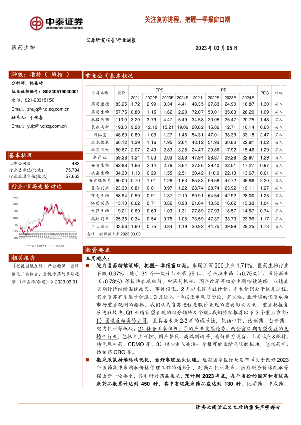 院内复苏持续演绎,把握一季报窗口期。本周沪深300上涨1.71%,医药生物行业下跌0.37%,处于31个一级子行业第25位,子板块中药(+0.75%)、医药商业(+0.73%)等板块表现较好,中医药振兴、国企改革等细分主题持续演绎,业绩真空期行情继续围绕政策、事件催化。2月以来院内就诊量、手术量仍处于恢复过程,需求复苏有望逐步加速。3月进入一季报逐步明朗阶段,需求端、业绩端的恢复成为市场重点观测的指标,我们认为复苏进程是股价表现的重要影响因素,重点把握复苏进程较快、Q1业绩有望表现的细分领域及个股。我们持续推荐以下3个重点方向:1)困境反转类的公司,且具备未来2-3年的成长性,包括中药、仿制药、创新药、院内耗材等板块。2)符合国家积极引导的产业发展趋势、两会窗口期有望受益的支持性行业,包括自主可控、国产替代、高端制造等,看好医疗设备、上游试剂&耗材、特色原料药、CDMO等。3)短期重点关注一季报可能业绩亮眼的板块,包括药店、仿制药CRO等。