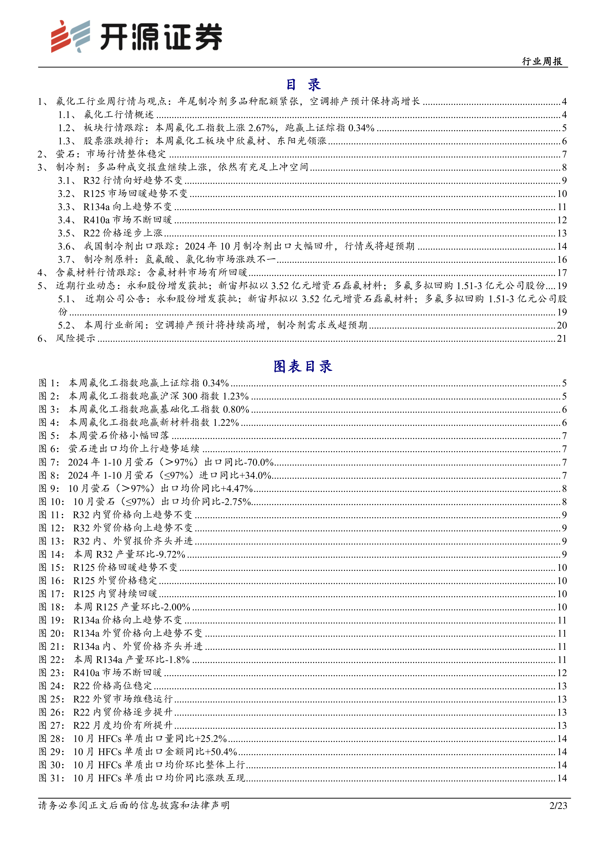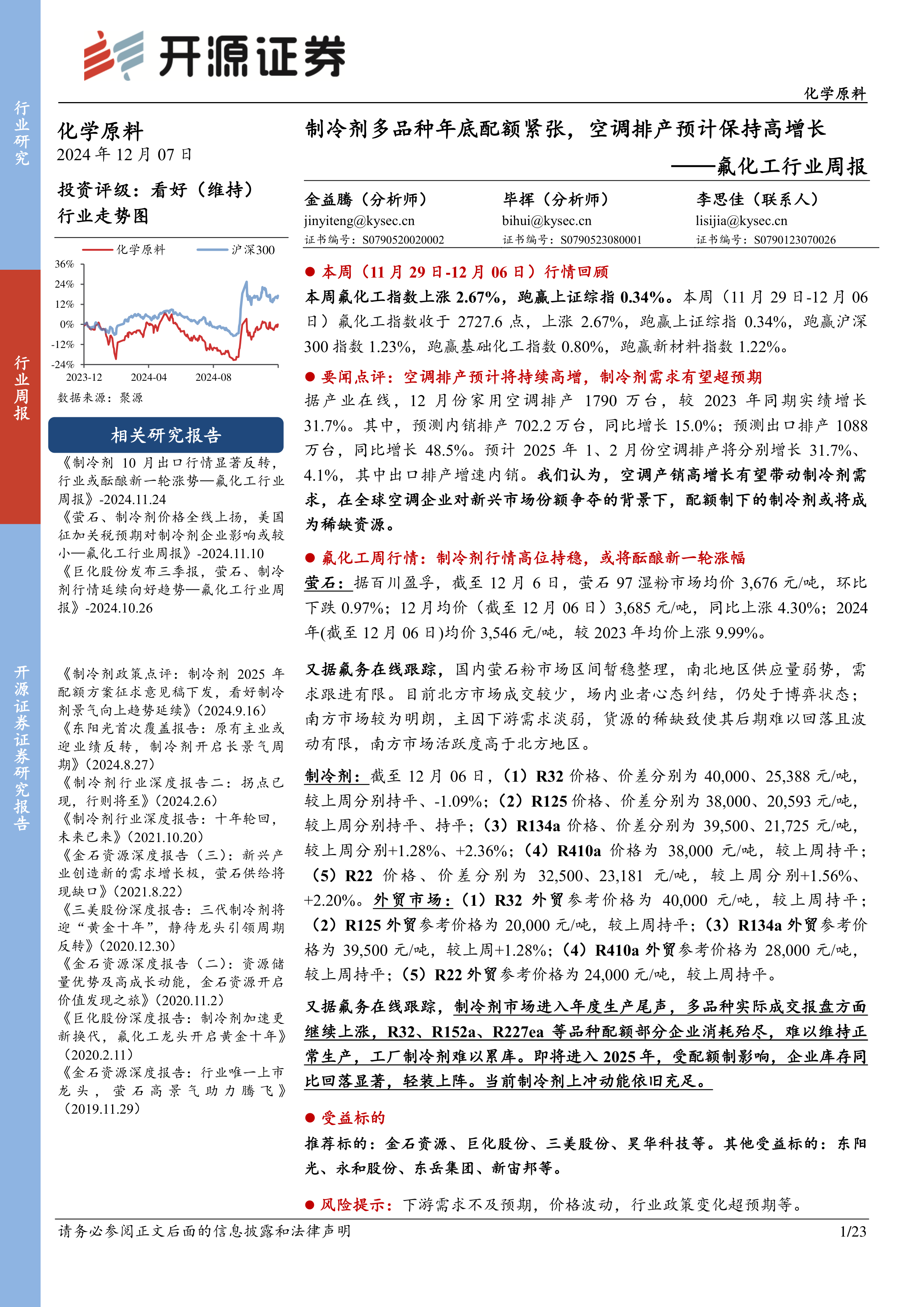 本报告分析了氟化工行业,特别是萤石和制冷剂市场的近期行情和未来走势。制冷剂市场在年底配额紧张和下游需求旺盛的双重作用下,价格持续上涨,并有进一步上涨的潜力。萤石市场则整体稳定,但南北地区存在差异。空调排产的持续高增长将进一步推动制冷剂需求,使得制冷剂成为稀缺资源。 报告最后还列出了受益标的和风险提示,为投资者提供参考。 总而言之,氟化工行业,特别是制冷剂板块,在政策利好和市场需求的共同驱动下,展现出较强的增长潜力和投资价值。 然而,投资者仍需关注下游需求变化、价格波动以及政策风险等因素。
