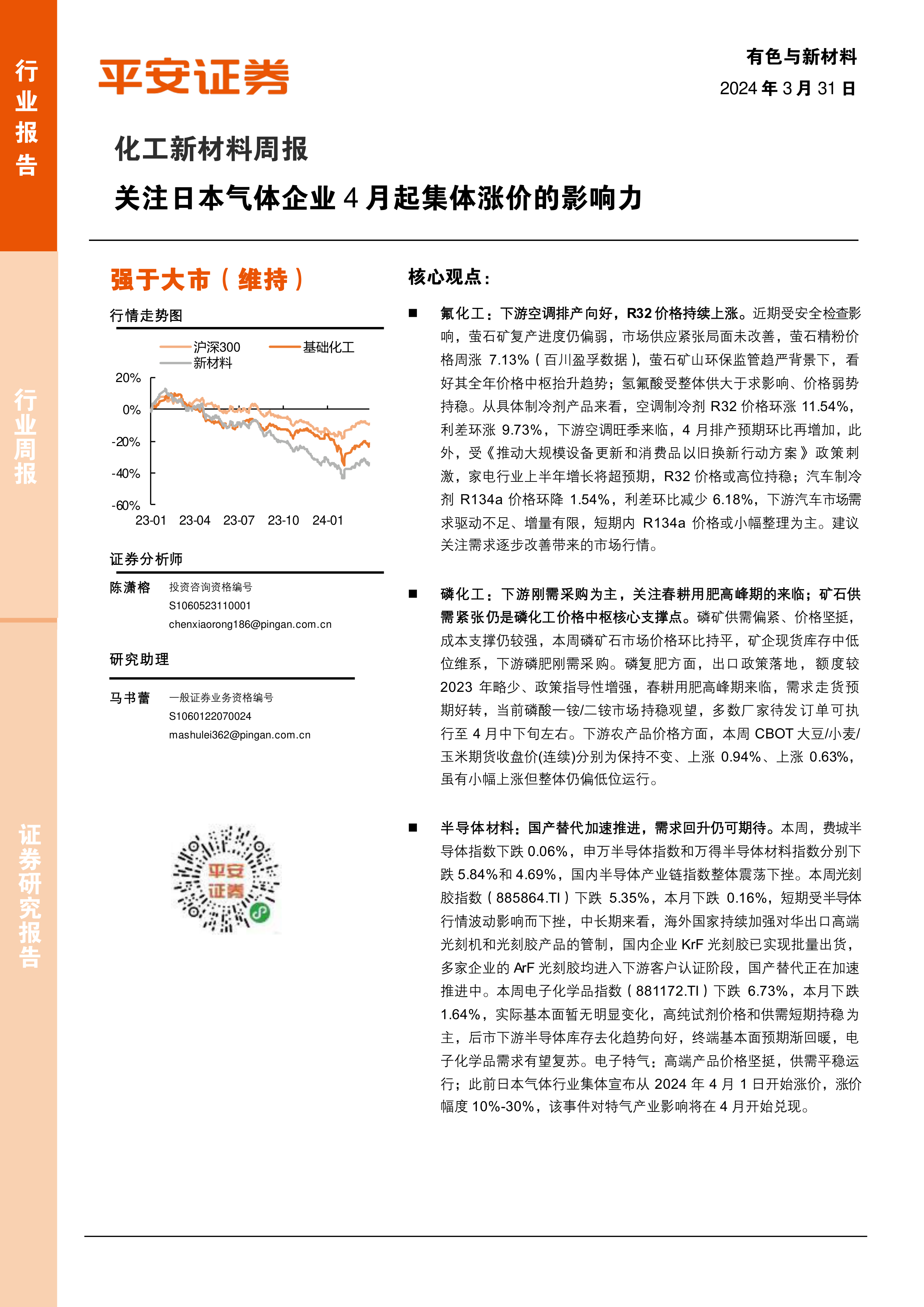 本报告的核心观点是:2024年3月31日,化工新材料市场行情波动较大,氟化工、磷化工和半导体材料板块表现值得关注。