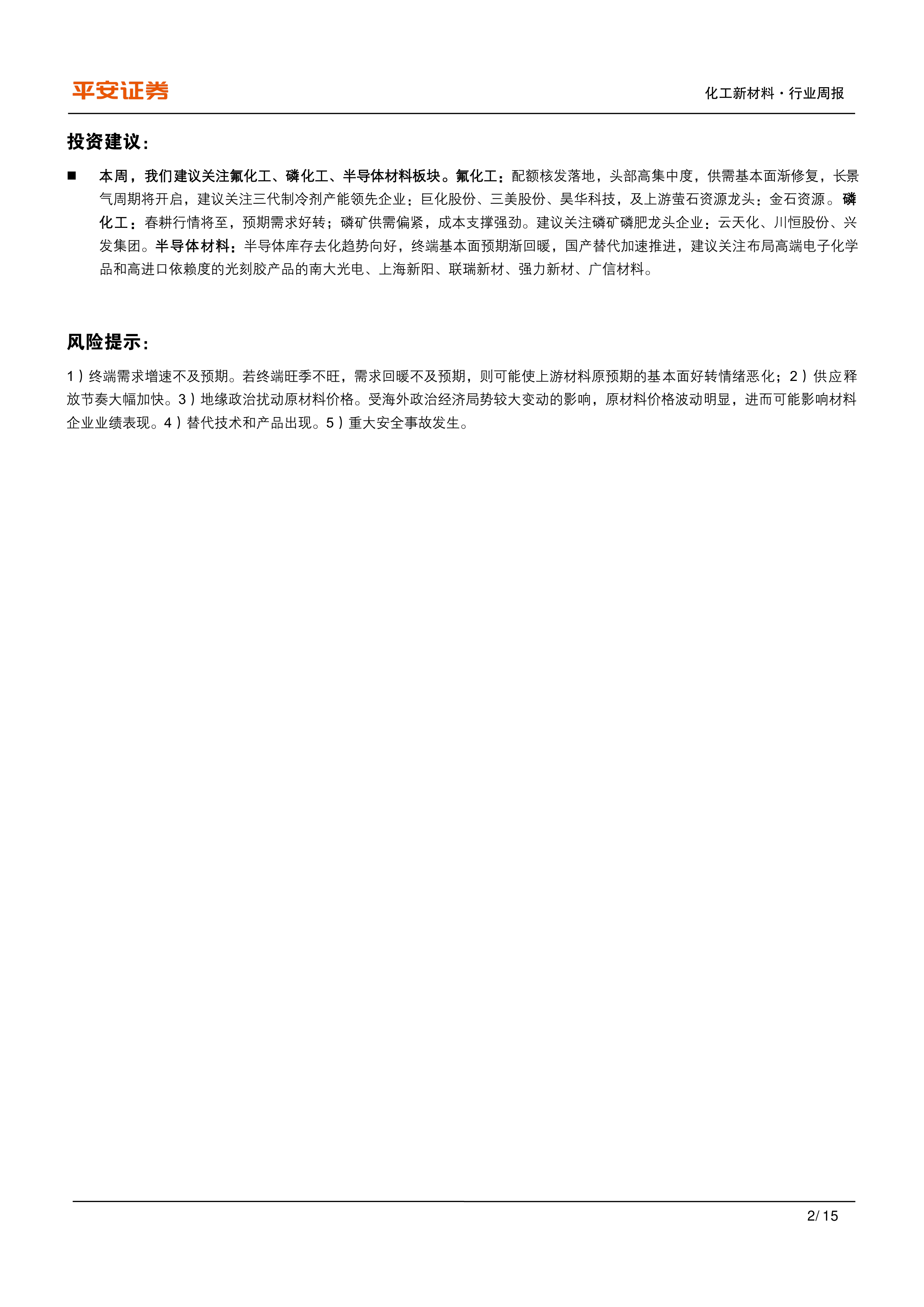 本周,我们建议关注氟化工、磷化工、半导体材料板块。氟化工:配额核发落地,头部高集中度,供需基本面渐修复,长景气周期将开启,建议关注三代制冷剂产能领先企业:巨化股份、三美股份、昊华科技,及上游萤石资源龙头:金石资源。磷化工:春耕行情将至,预期需求好转;磷矿供需偏紧,成本支撑强劲。建议关注磷矿磷肥龙头企业:云天化、川恒股份、兴发集团。半导体材料:半导体库存去化趋势向好,终端基本面预期渐回暖,国产替代加速推进,建议关注布局高端电子化学品和高进口依赖度的光刻胶产品的南大光电、上海新阳、联瑞新材、强力新材、广信材料。