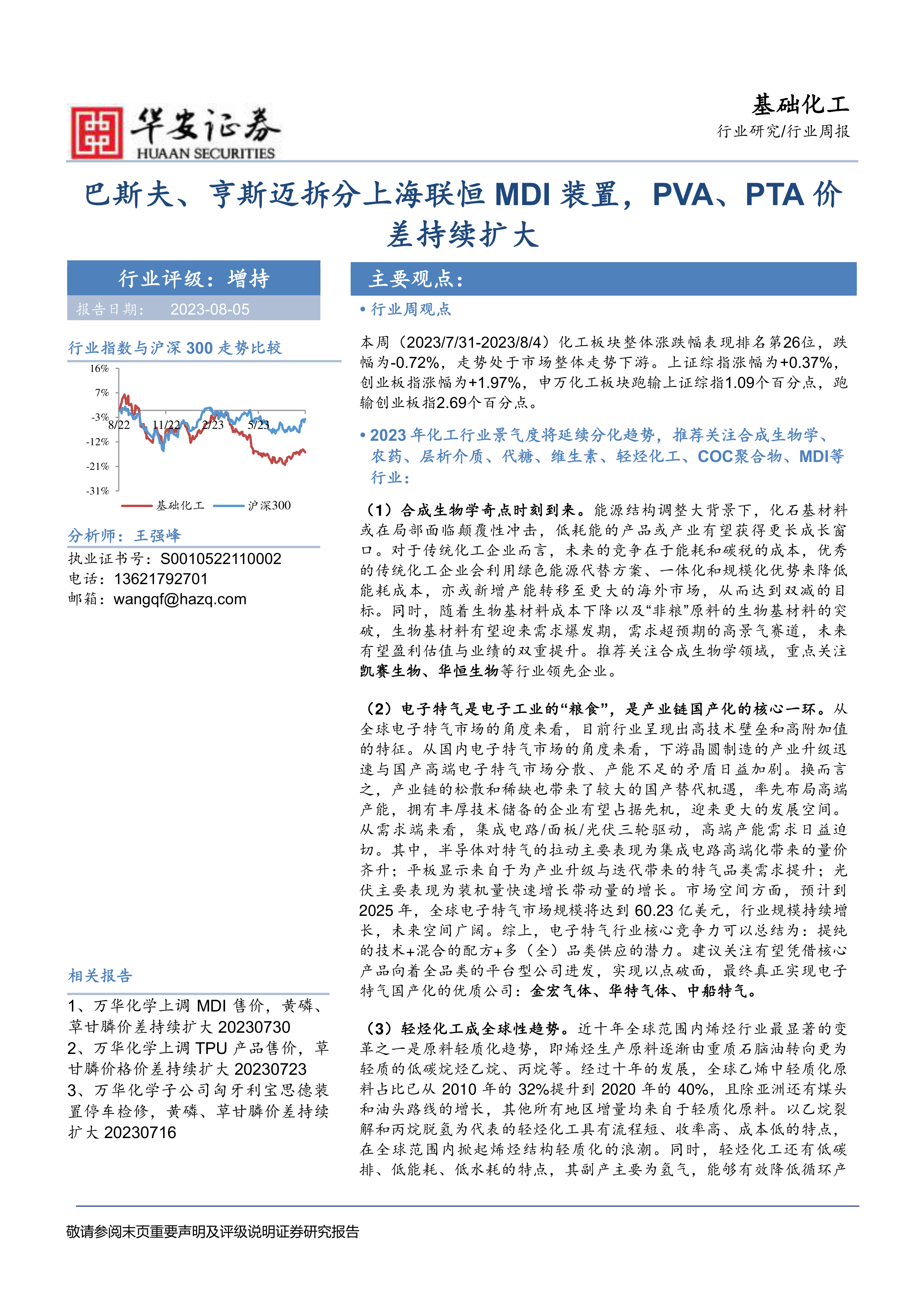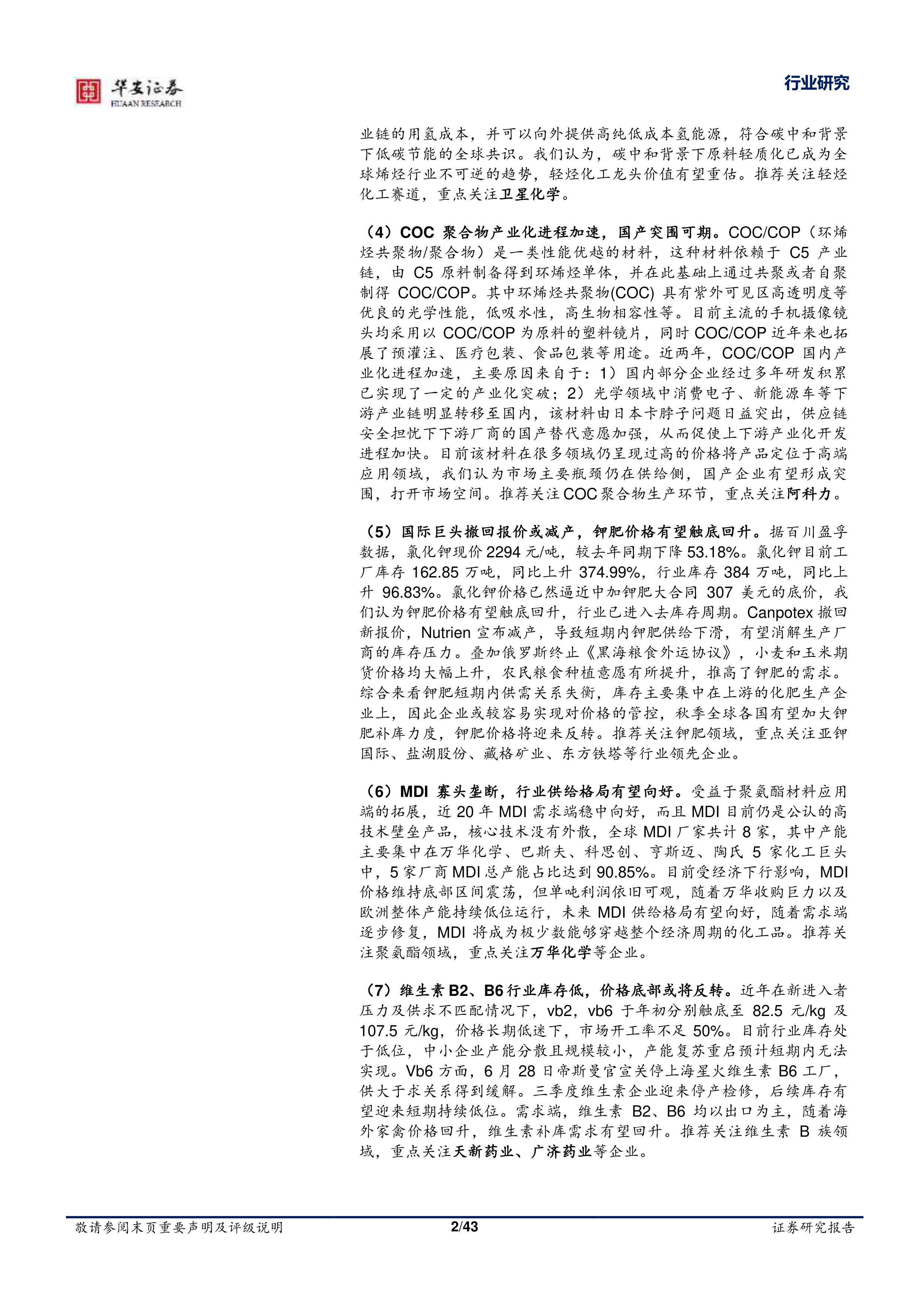 报告特别针对合成生物学、电子特气、轻烃化工、COC聚合物、钾肥、MDI以及维生素B2、B6七个细分行业进行了深入分析,并推荐了部分重点关注的上市公司。