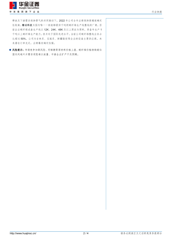 风险提示:市场竞争加剧风险、丙烯腈等原材料价格上涨、碳纤维价格持续高位国内风电叶片需求受阻难以放量、中游企业扩产不及预期。