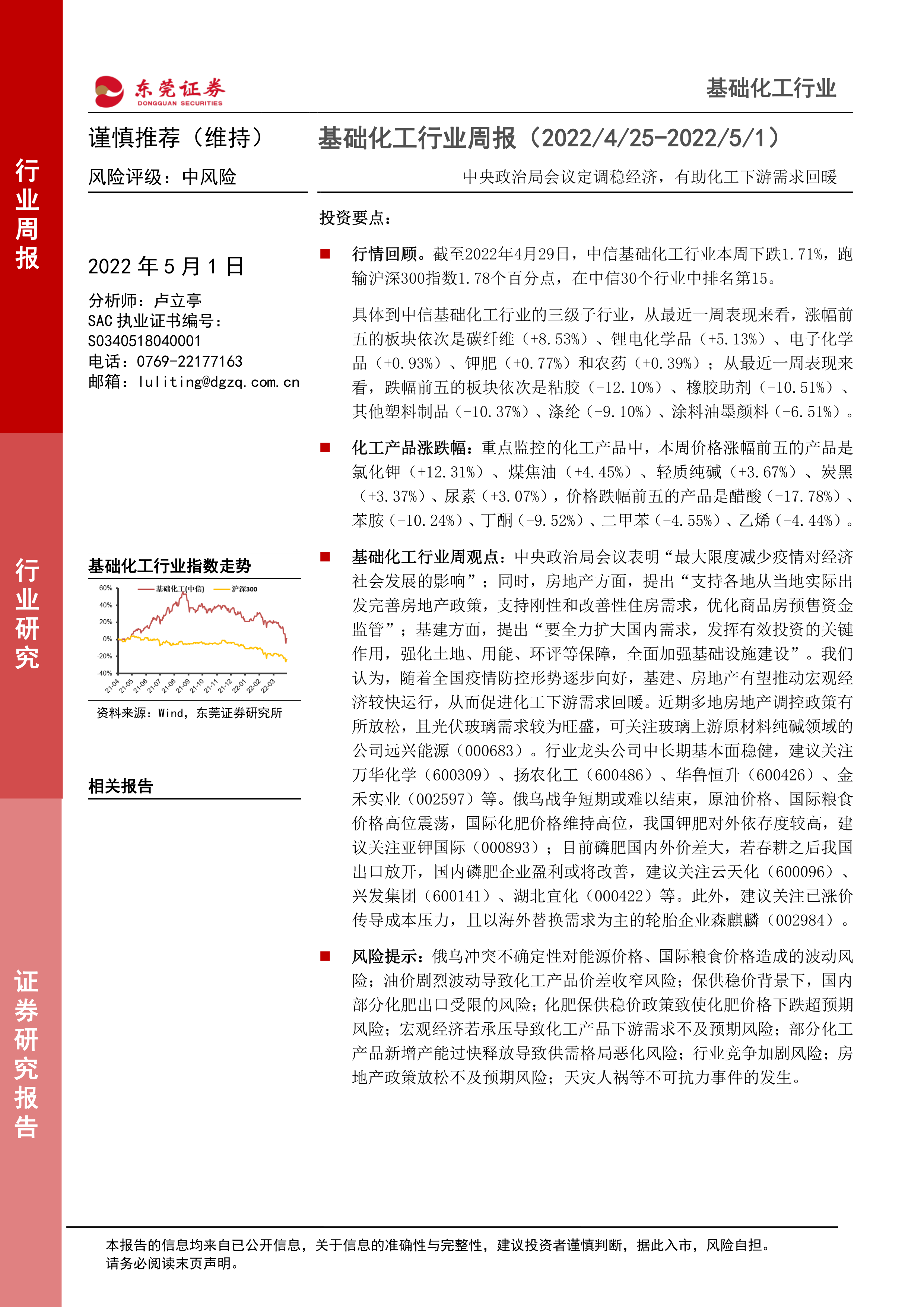 基础化工行业周观点:中央政治局会议表明“最大限度减少疫情对经济社会发展的影响”;同时,房地产方面,提出“支持各地从当地实际出发完善房地产政策,支持刚性和改善性住房需求,优化商品房预售资金监管”;基建方面,提出“要全力扩大国内需求,发挥有效投资的关键作用,强化土地、用能、环评等保障,全面加强基础设施建设”。我们认为,随着全国疫情防控形势逐步向好,基建、房地产有望推动宏观经济较快运行,从而促进化工下游需求回暖。近期多地房地产调控政策有所放松,且光伏玻璃需求较为旺盛,可关注玻璃上游原材料纯碱领域的公司远兴能源(000683)。行业龙头公司中长期基本面稳健,建议关注万华化学(600309)、扬农化工(600486)、华鲁恒升(600426)、金禾实业(002597)等。俄乌战争短期或难以结束,原油价格、国际粮食价格高位震荡,国际化肥价格维持高位,我国钾肥对外依存度较高,建议关注亚钾国际(000893);目前磷肥国内外价差大,若春耕之后我国出口放开,国内磷肥企业盈利或将改善,建议关注云天化(600096)、兴发集团(600141)、湖北宜化(000422)等。此外,建议关注已涨价传导成本压力,且以海外替换需求为主的轮胎企业森麒麟(002984)。