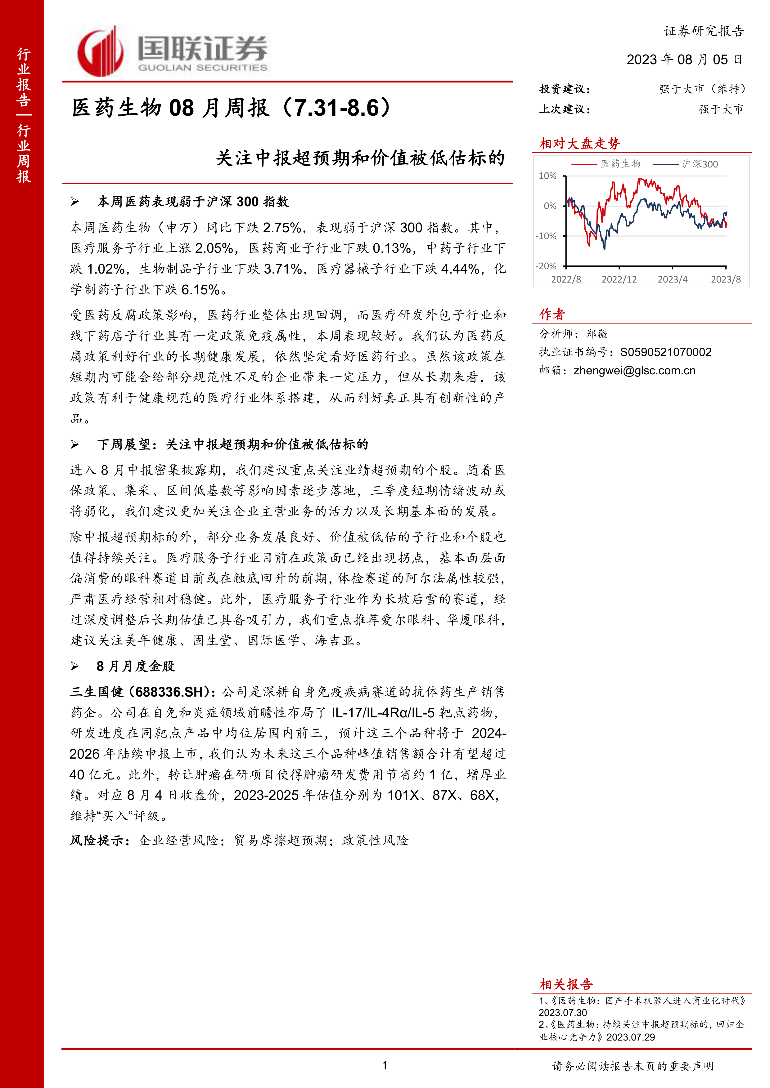 三生国健( 688336.SH): 公司是深耕自身免疫疾病赛道的抗体药生产销售药企。公司在自免和炎症领域前瞻性布局了 IL-17/IL-4Rα/IL-5 靶点药物,研发进度在同靶点产品中均位居国内前三,预计这三个品种将于 2024-2026 年陆续申报上市,我们认为未来这三个品种峰值销售额合计有望超过40 亿元。此外,转让肿瘤在研项目使得肿瘤研发费用节省约 1 亿,增厚业绩。 对应 8 月 4 日收盘价, 2023-2025 年估值分别为 101X、 87X、 68X,维持“买入”评级。