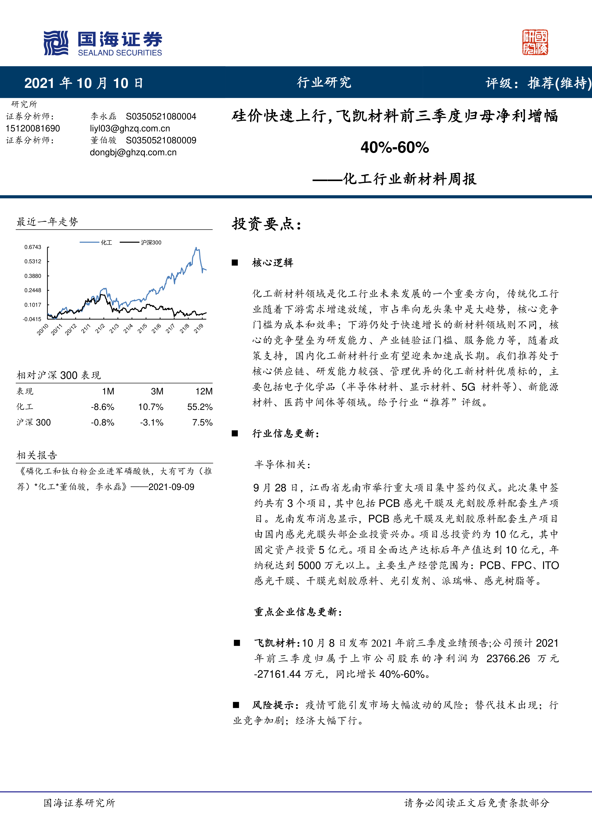 化工行业新材料周报:硅价快速上行,飞凯材料前三季度归母净利增幅40%-60%