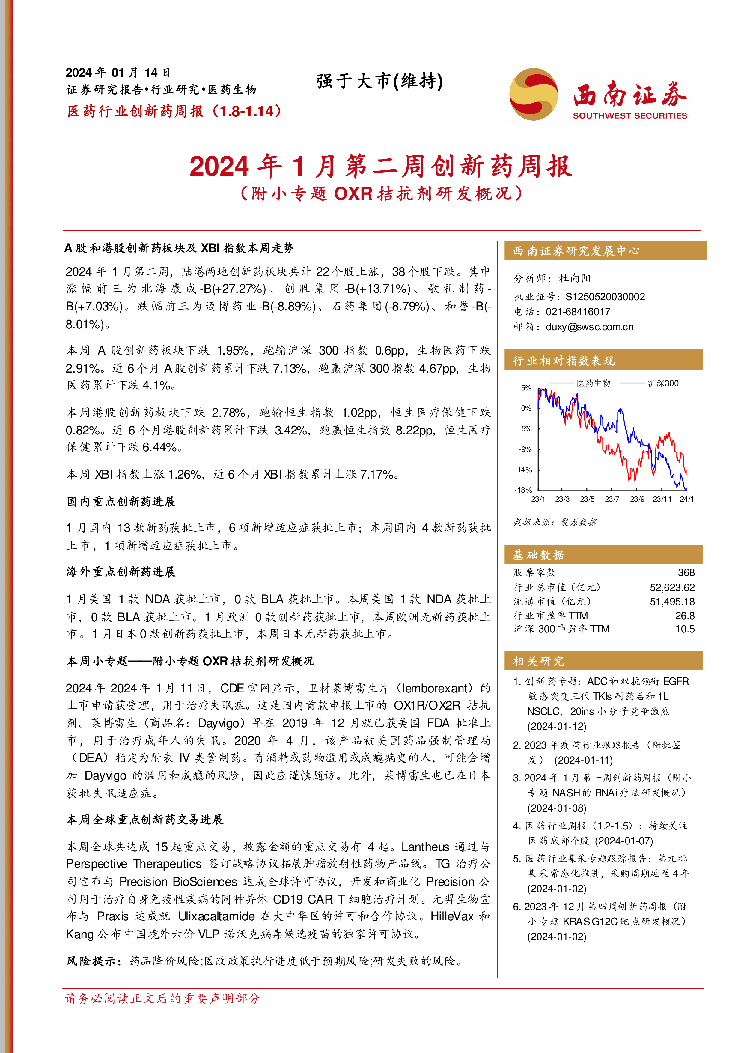 本报告的核心观点是:2024年1月第二周,A股和港股创新药板块整体表现弱于大市,但与近6个月表现相比,A股跑赢沪深300指数,港股跑赢恒生指数。国内创新药研发进展显著,1月份获批上市新药数量较多,但板块整体走势受市场大环境影响。 同时,报告特别关注了OX1R/OX2R拮抗剂的研发进展,并对本周国内外重点创新药交易进行了分析。