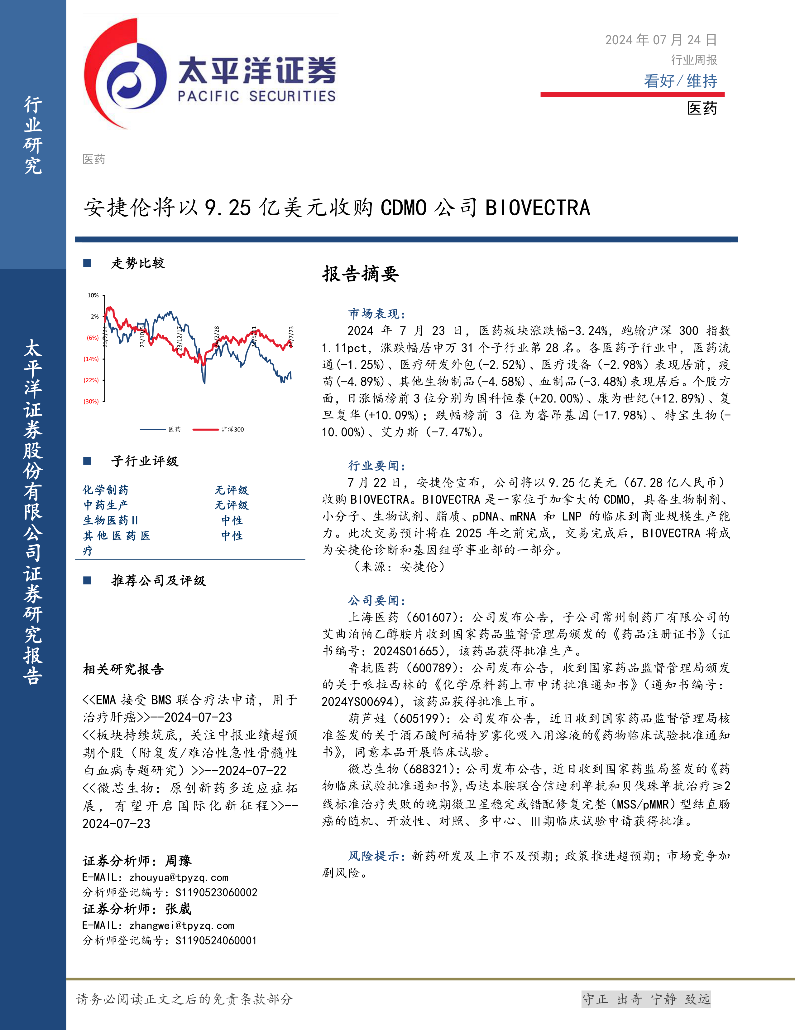 本报告对2024年7月24日医药行业周报进行了数据分析和解读。报告指出,医药行业整体表现分化,部分子行业表现强劲,部分子行业表现疲软;安捷伦收购BIOVECTRA事件对CDMO行业产生积极影响;多家医药公司取得药品注册证书或临床试验批准,展现行业发展活力。 投资者需密切关注行业动态,深入分析市场变化,谨慎做出投资决策。 未来研究需要进一步关注行业政策变化、市场竞争格局以及技术创新对医药行业发展的影响。
