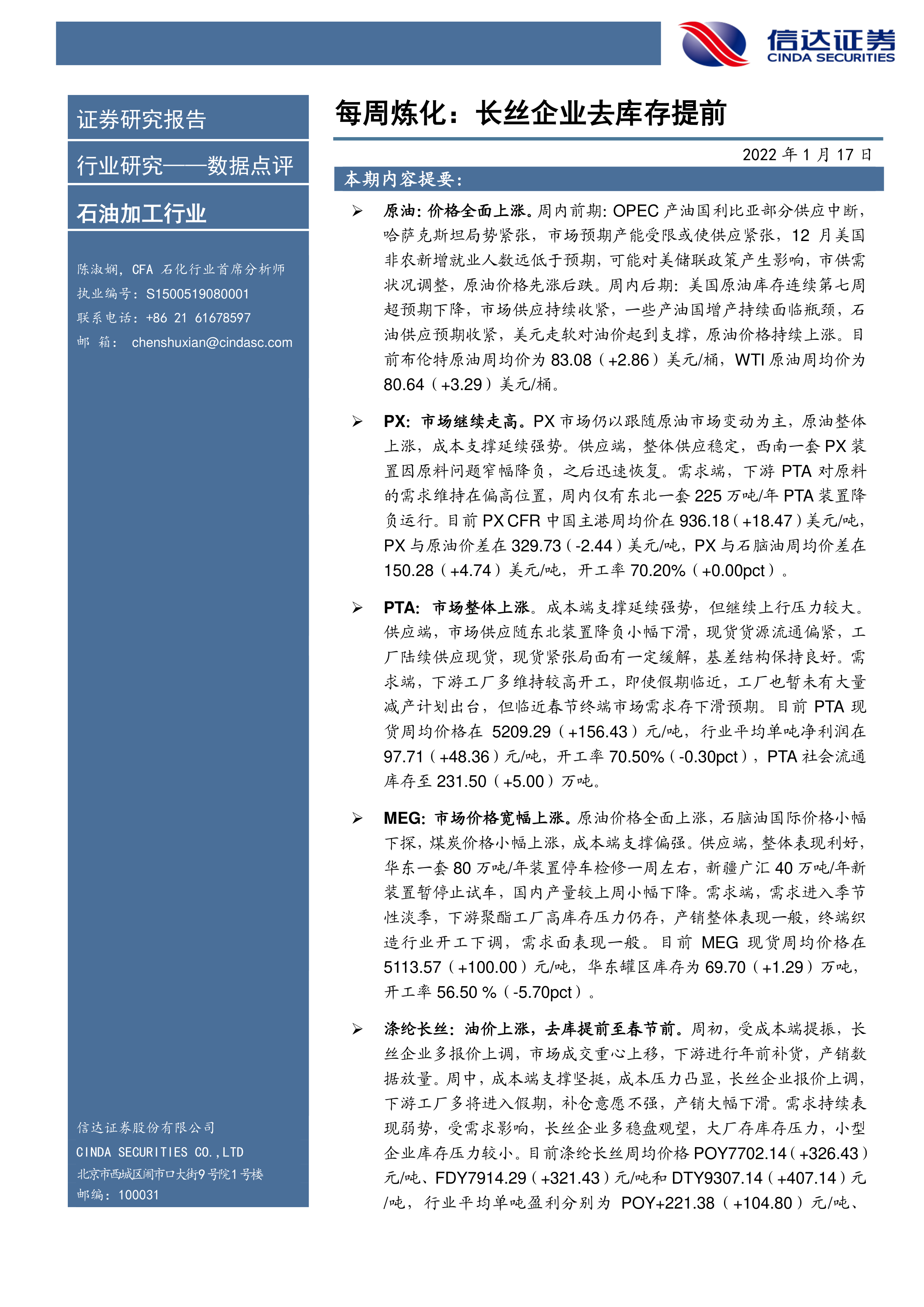 本报告对石油加工行业及相关产业链进行了数据分析,涵盖原油、PX、PTA、MEG、涤纶长丝、织布、涤纶短纤和聚酯瓶片等多个环节。