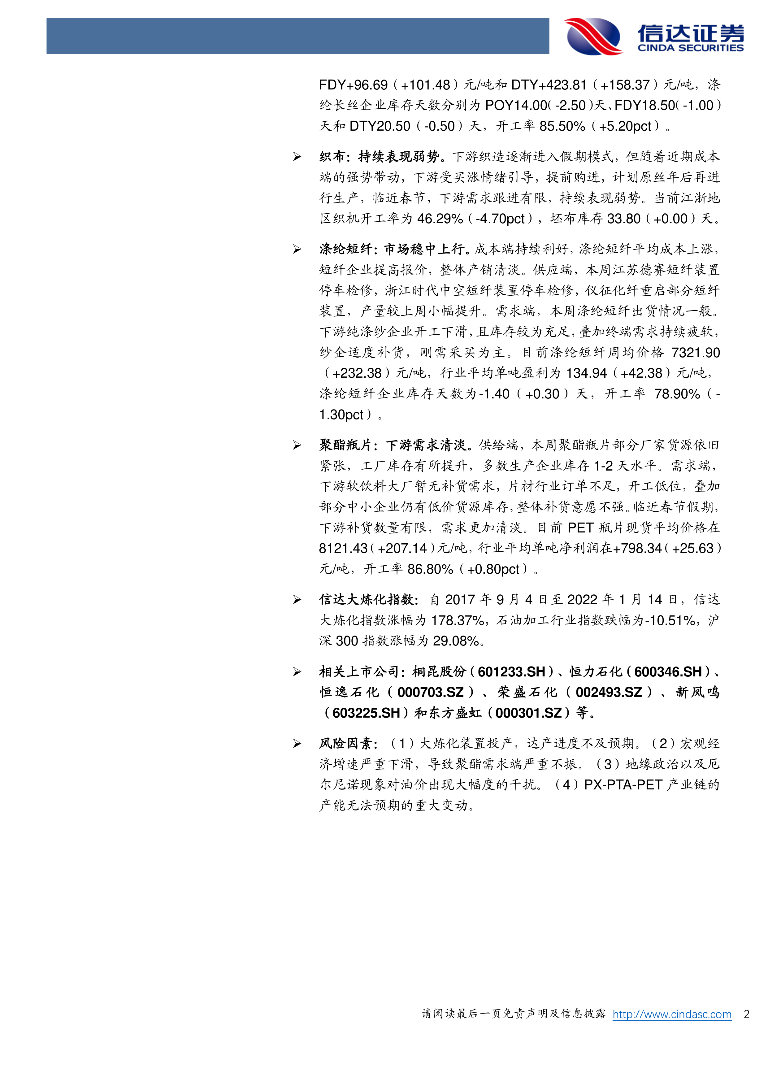 聚酯瓶片:下游需求清淡。供给端,本周聚酯瓶片部分厂家货源依旧紧张,工厂库存有所提升,多数生产企业库存1-2天水平。需求端,下游软饮料大厂暂无补货需求,片材行业订单不足,开工低位,叠加部分中小企业仍有低价货源库存,整体补货意愿不强。临近春节假期,下游补货数量有限,需求更加清淡。目前PET瓶片现货平均价格在8121.43(+207.14)元/吨,行业平均单吨净利润在+798.34(+25.63)元/吨,开工率86.80%(+0.80pct)。