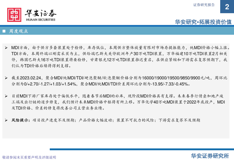 报告认为,未来春季行情以及地产竣工端和出行链的逐步修复,将进一步提振下游需求,从而推动MDI价格中枢上移。万华化学于2022年底投产的40万吨MDI装置,将进一步增强其市场竞争力,并受益于MDI和TDI价格的回升。