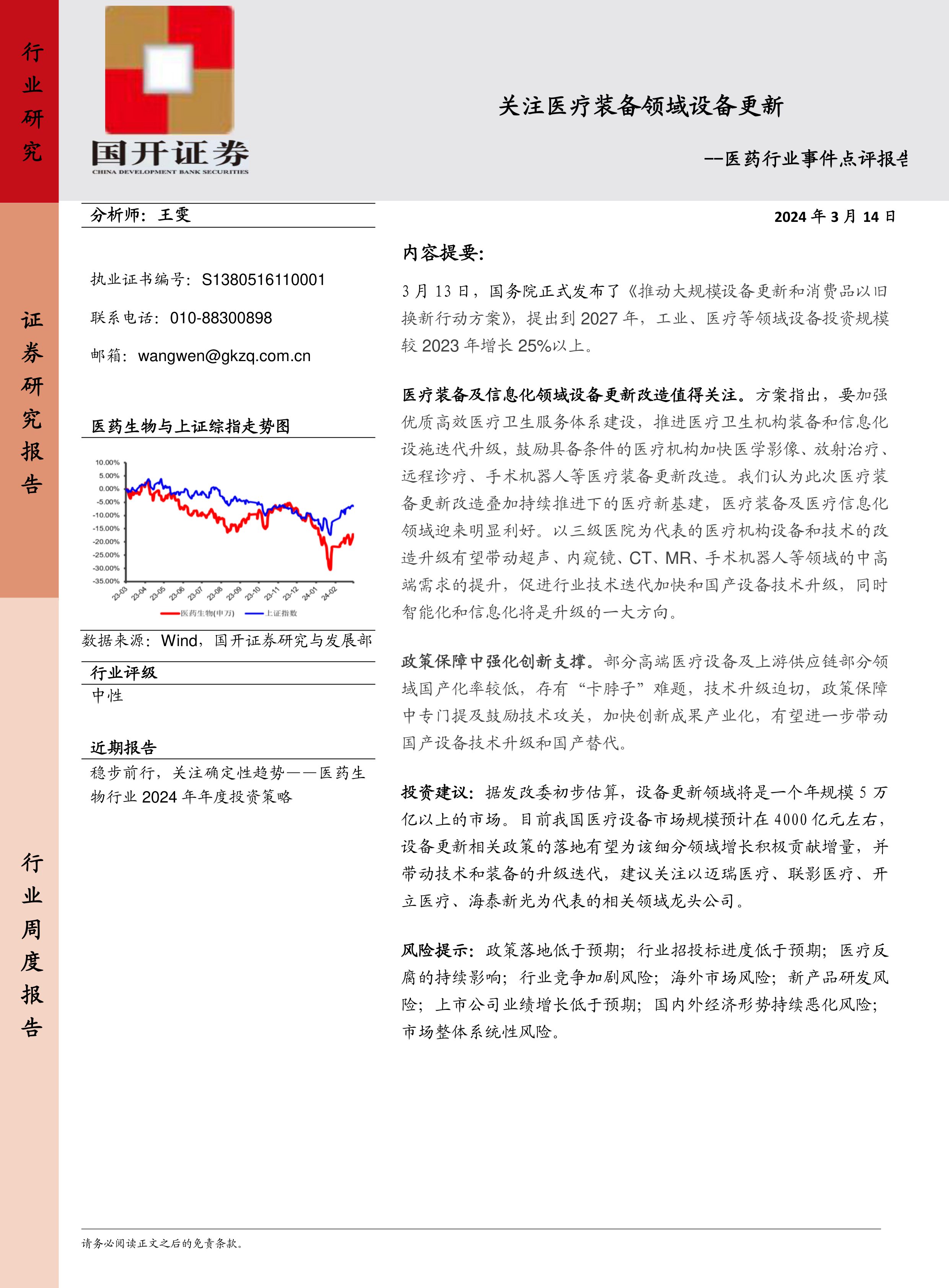 本报告基于国务院发布的《推动大规模设备更新和消费品以旧换新行动方案》,对医疗装备行业进行了深入分析。 报告认为,该方案将显著推动医疗设备市场增长,加速行业技术迭代和国产替代,并促进医疗机构设备和技术的升级改造。 报告建议投资者关注相关领域的龙头企业,同时需关注报告中列出的各种风险因素。 报告数据主要来源于Wind和国开证券研究与发展部。 需要注意的是,报告中的信息和观点仅供参考,不构成投资建议,投资者需自行承担投资风险。