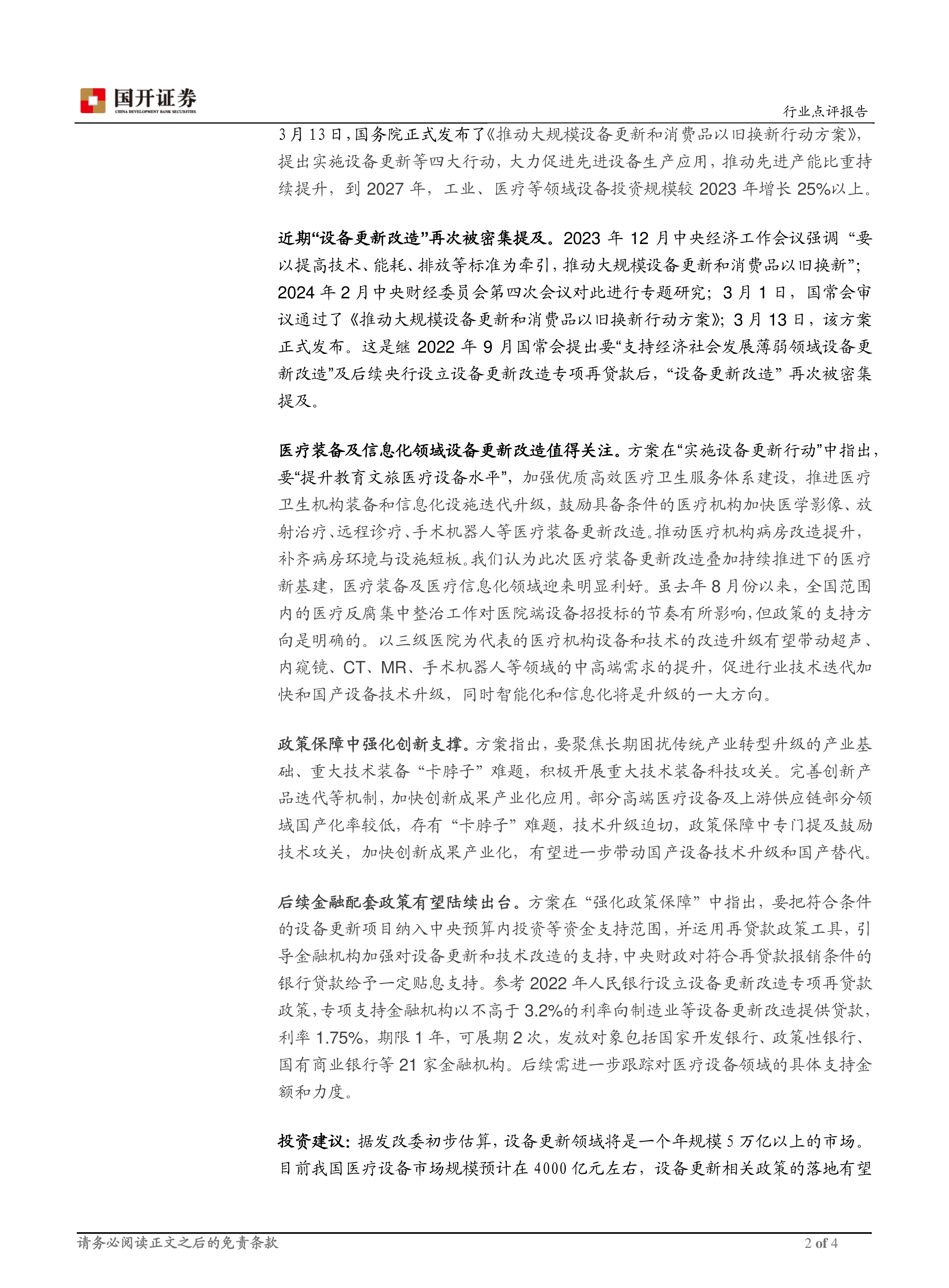 本报告的核心观点是:国务院发布的《推动大规模设备更新和消费品以旧换新行动方案》为医疗装备及信息化领域带来重大利好。该方案预计将推动医疗设备市场规模增长,加速行业技术迭代和国产替代进程,并促进医疗机构设备和技术的升级改造。 建议关注相关领域的龙头企业。