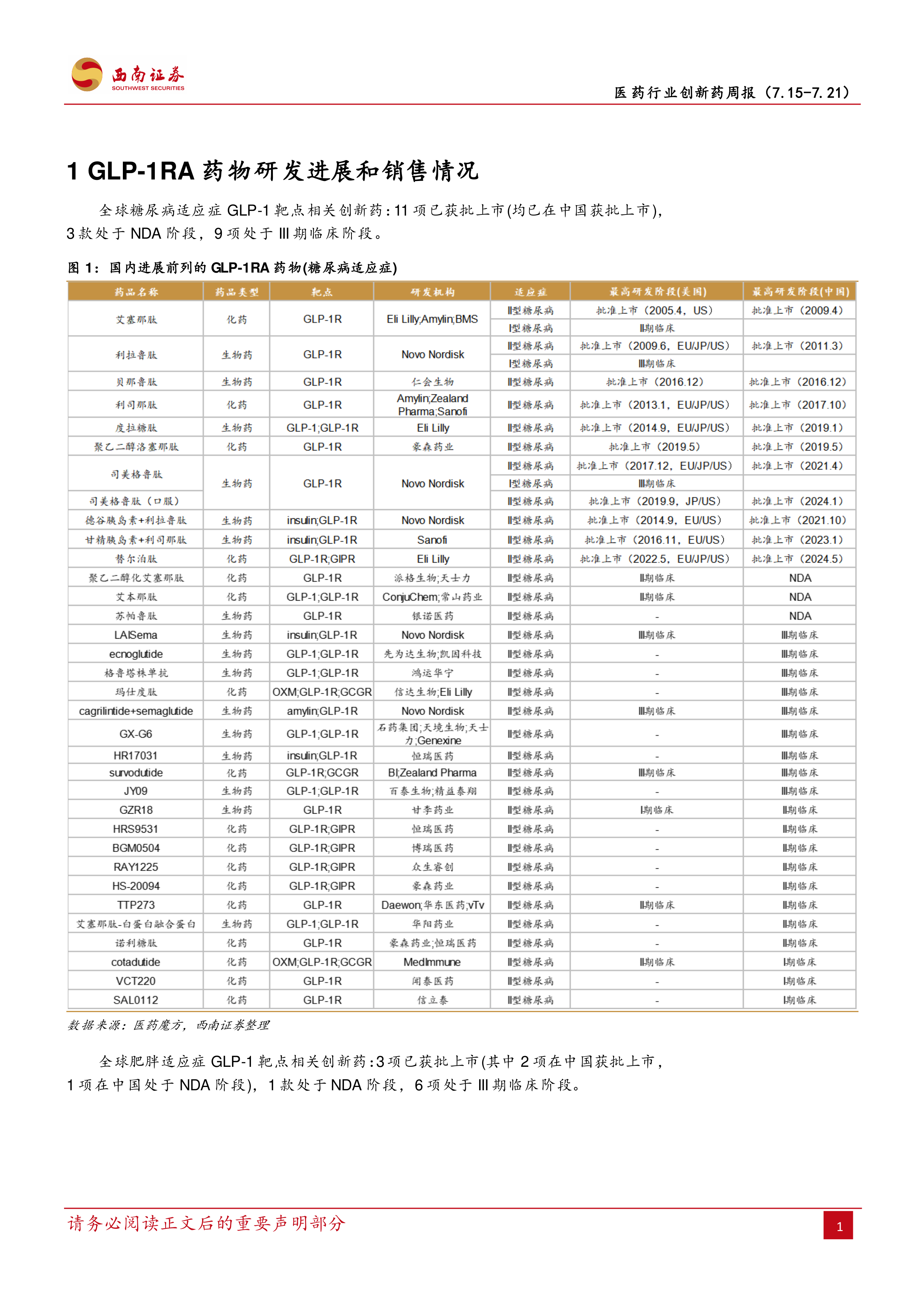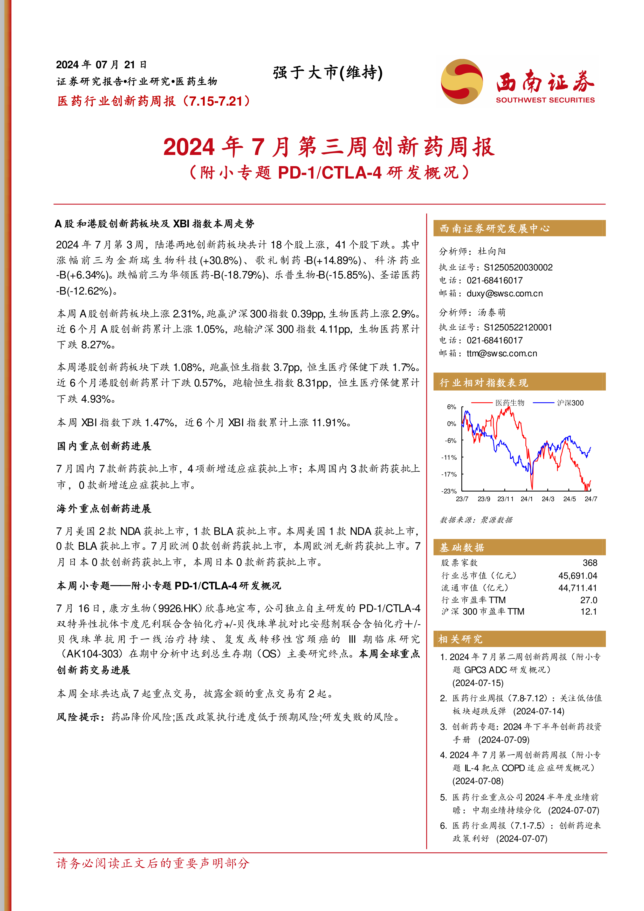 本报告基于西南证券对2024年7月15日至7月21日一周内医药行业创新药市场的研究,核心观点如下: