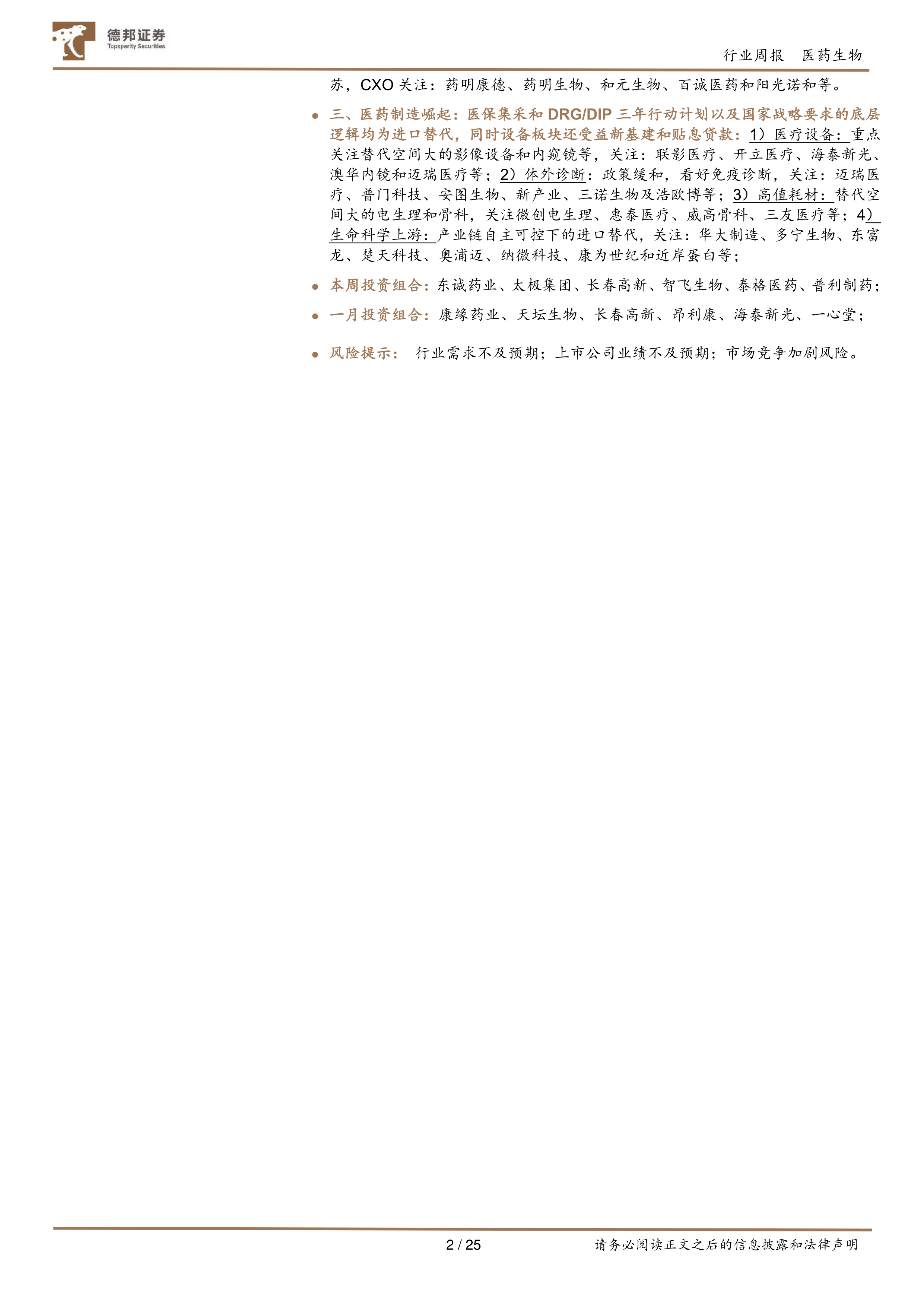 报告最后给出了本周和一月投资组合建议,分别推荐了多只股票,涵盖了医药消费、医药科技和医药制造等多个领域。