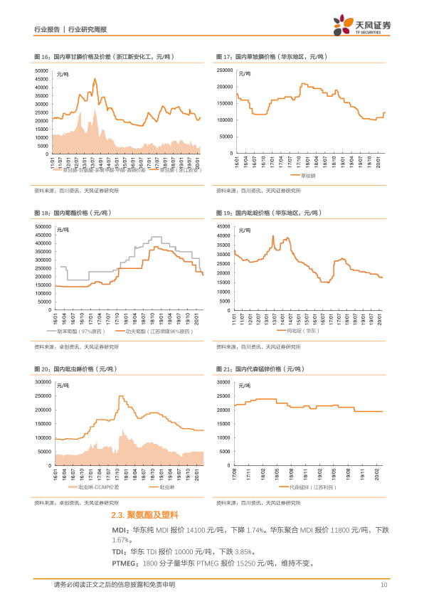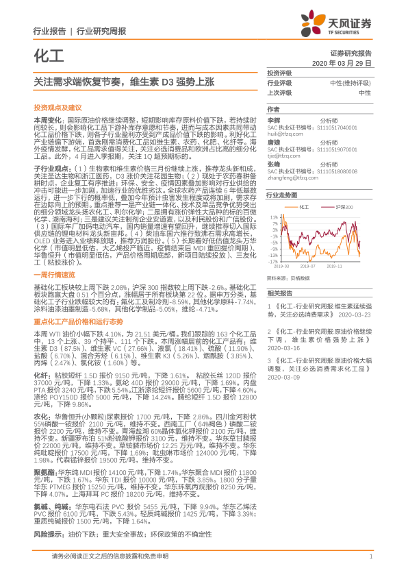 子行业观点:(1)生物素和维生素价格三月份继续上涨,推荐龙头新和成,关注圣达生物和浙江医药,D3涨价关注花园生物;(2)现处于农药春耕备耕时点,企业复工有序推进;环保、安全、疫情因素叠加影响对行业供给的冲击可能进一步加剧,加速行业的优胜劣汰。全球农药产品连续6年低基数运行,进一步下行的概率低,叠加今年预计虫害发生程度或将加剧,需求存在边际向上的预期。重点推荐一是产业链一体化、技术及单品竞争优势突出的细分领域龙头扬农化工、利尔化学;二是拥有涨价弹性大品种的标的百傲化学、湖南海利;三是建议关注制剂企业安道麦,以及利民股份和广信股份。(3)国际车厂加码电动汽车,国内销量增速有望回升,继续推荐切入国际供应链的锂电材料龙头新宙邦。(4)柴油车国六推行致沸石需求高增长,OLED业务进入业绩释放期,推荐万润股份。(5)长期看好低估值龙头万华化学(市值明显低估,大乙烯投产临近,疫情结束后MDI重回提价周期)、华鲁恒升(市值明显低估,产品价格周期底部,新项目陆续投放)、三友化工(粘胶涨价)。