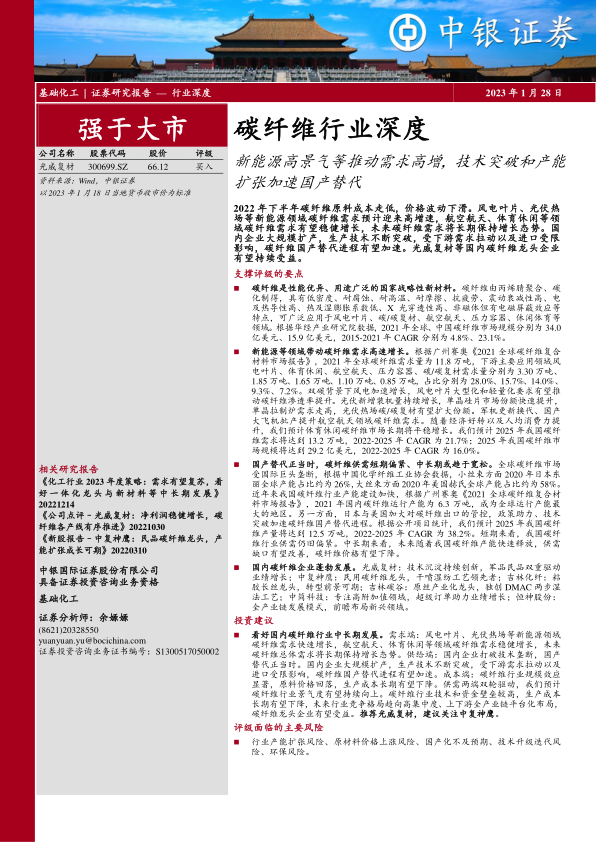 报告推荐光威复材,建议关注中复神鹰。 并对行业发展面临的风险进行了提示,包括行业产能扩张风险、原材料价格上涨风险、国产化不及预期、技术升级迭代风险和环保风险等。