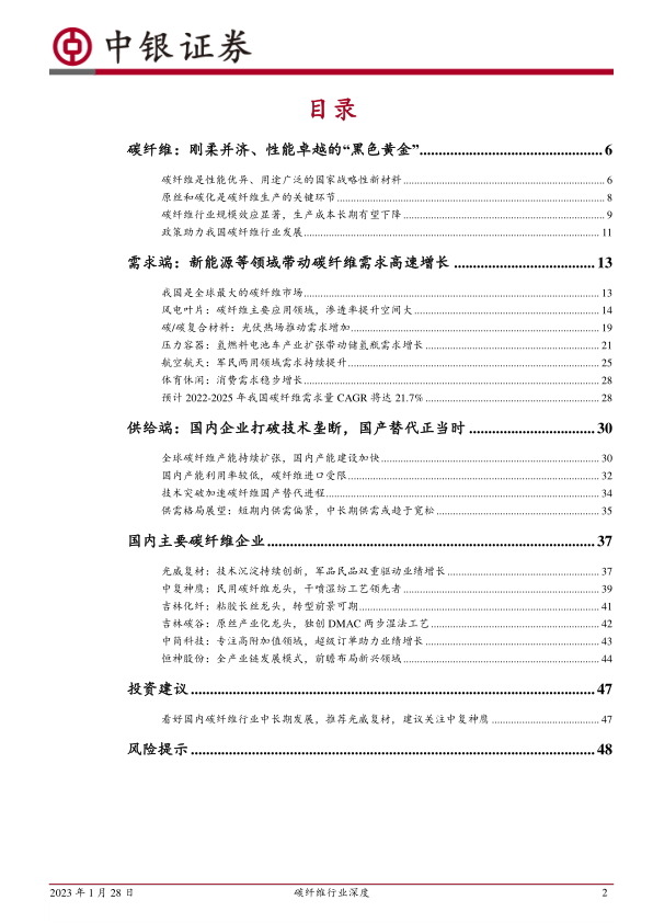 看好国内碳纤维行业中长期发展。 需求端:风电叶片、光伏热场等新能源领域碳纤维需求快速增长,航空航天、体育休闲等领域碳纤维需求稳健增长,未来碳纤维总体需求将长期保持增长态势。供给端:国内企业打破技术垄断,国产替代正当时。国内企业大规模扩产,生产技术不断突破,受下游需求拉动以及进口受限影响,碳纤维国产替代进程有望加速。成本端:碳纤维行业规模效应显著,原料价格回落,生产成本长期有望下降。供需两端双轮驱动,我们预计碳纤维行业景气度有望持续向上。碳纤维行业技术和资金壁垒较高,生产成本长期有望下降,未来行业竞争格局趋向高集中度、上下游全产业链平台化布局,碳纤维龙头企业有望受益。 推荐光威复材,建议关注中复神鹰。